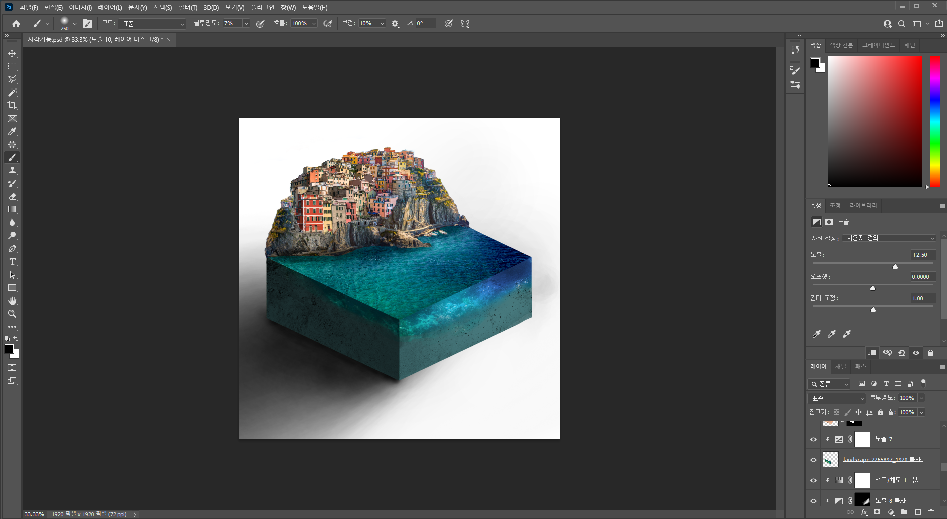 조정 레이어 - 노출을 선택한 후 값을 조절하여 전체적으로 어둡게 만든 후 Ctrl + I를 눌러서 영역을 반전시키고 브러시를 선택 후 흰색으로 살짝살짝 그림자가 필요한 부분을 칠해줍니다.