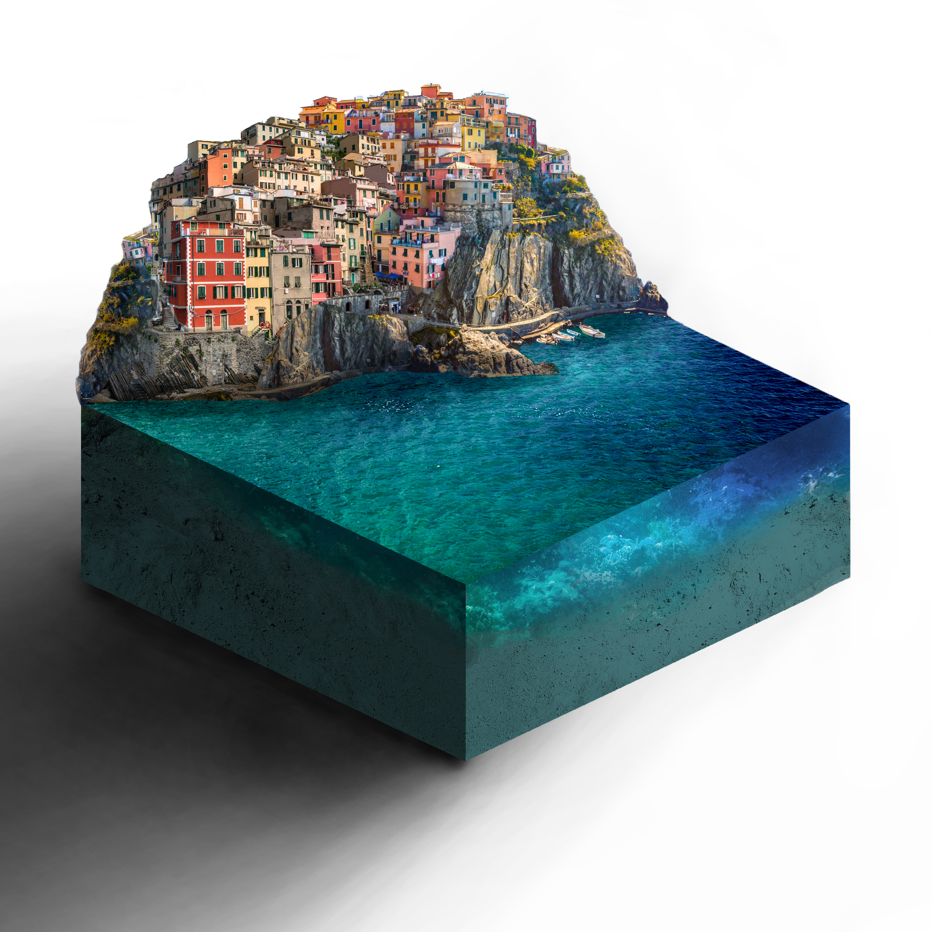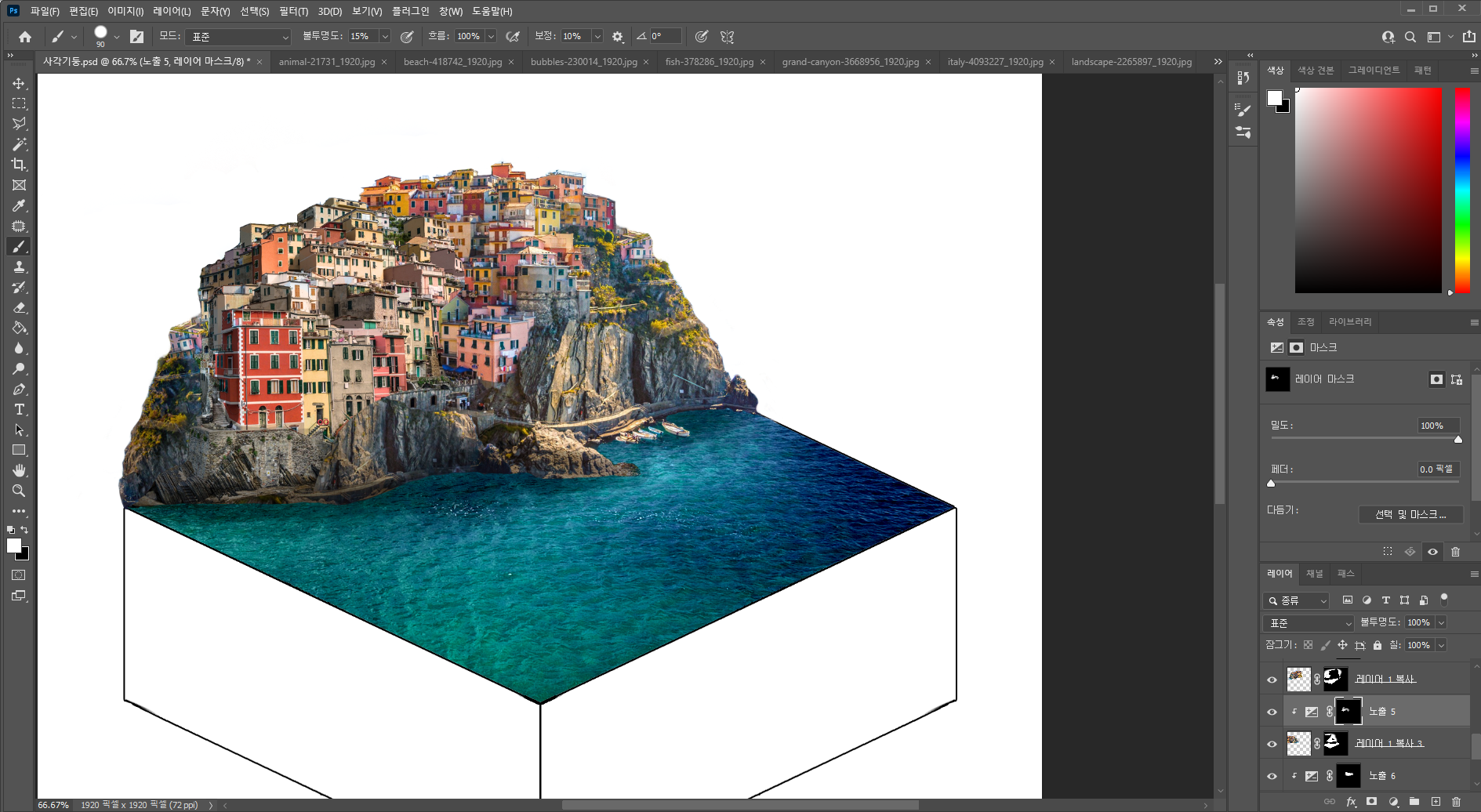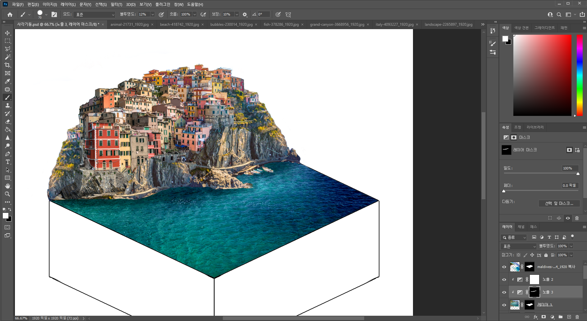 이제 옆면을 만들어줄 건데, 대충 땅 사진을 가져와서 마스크를 씌워주세요. 마스크는 육면체가 있는 레이어에서 해당 부분을 선택 툴로 영역을 선택하고 이미지가 있는 레이어를 선택하여 조정 레이어 왼쪽의 네모 안에 검은 점이 있는 아이콘을 누르면 마스크가 씌워집니다.