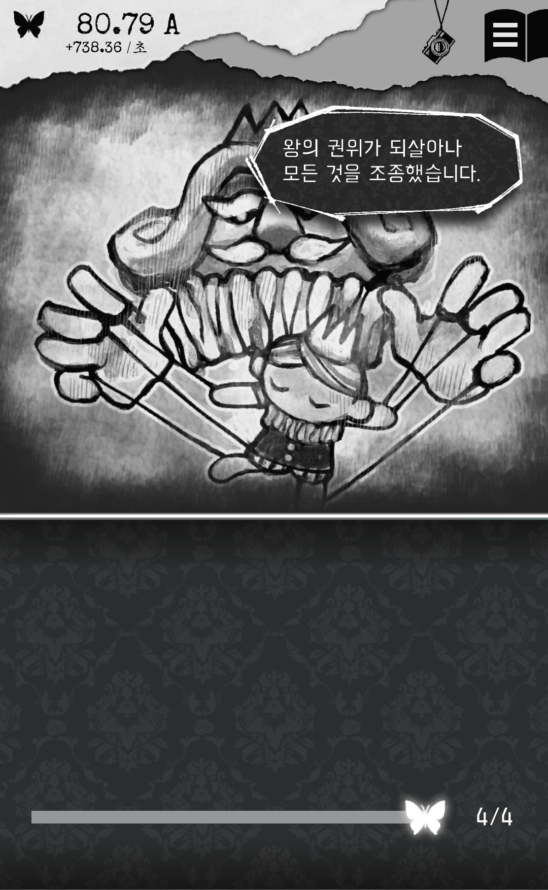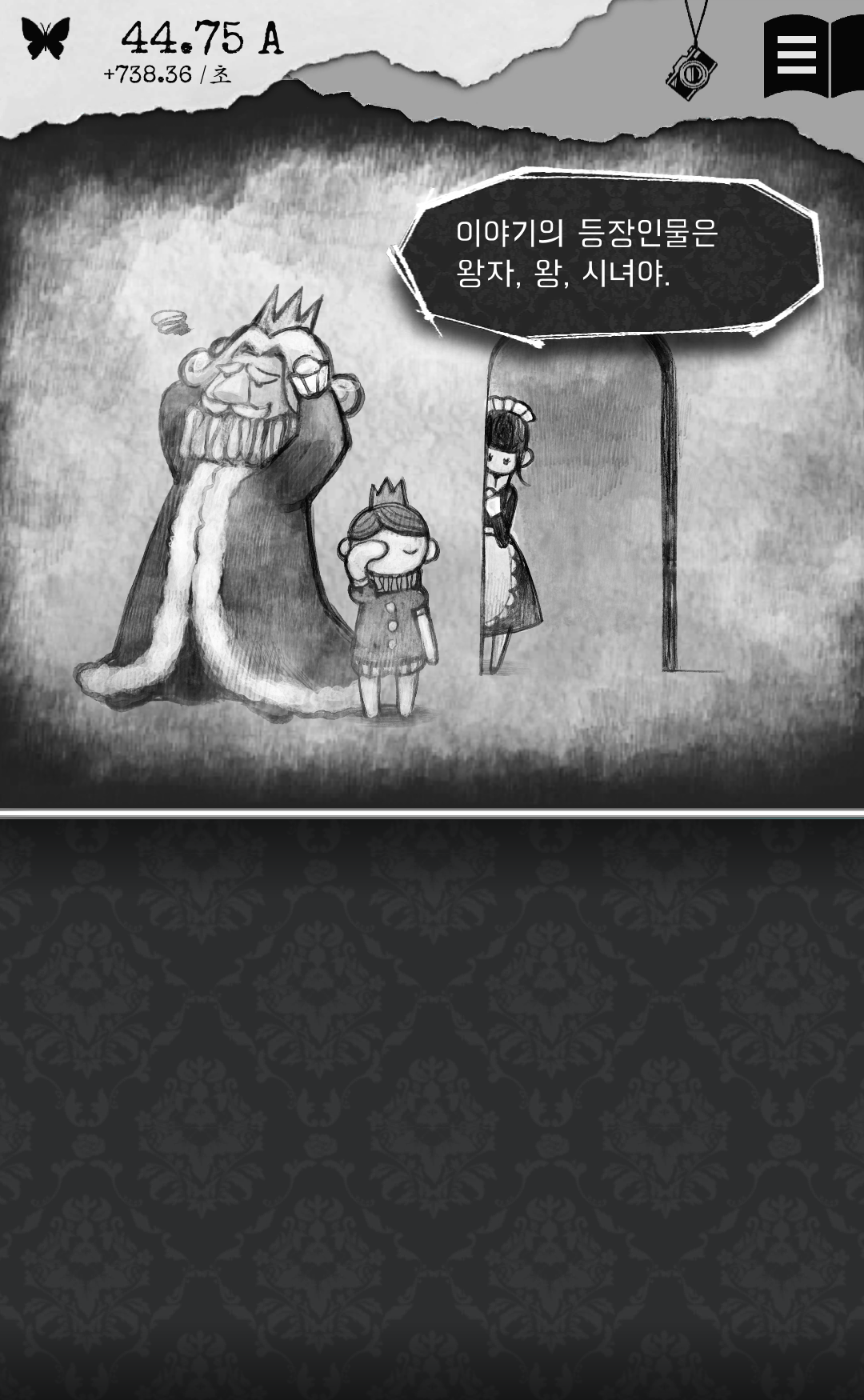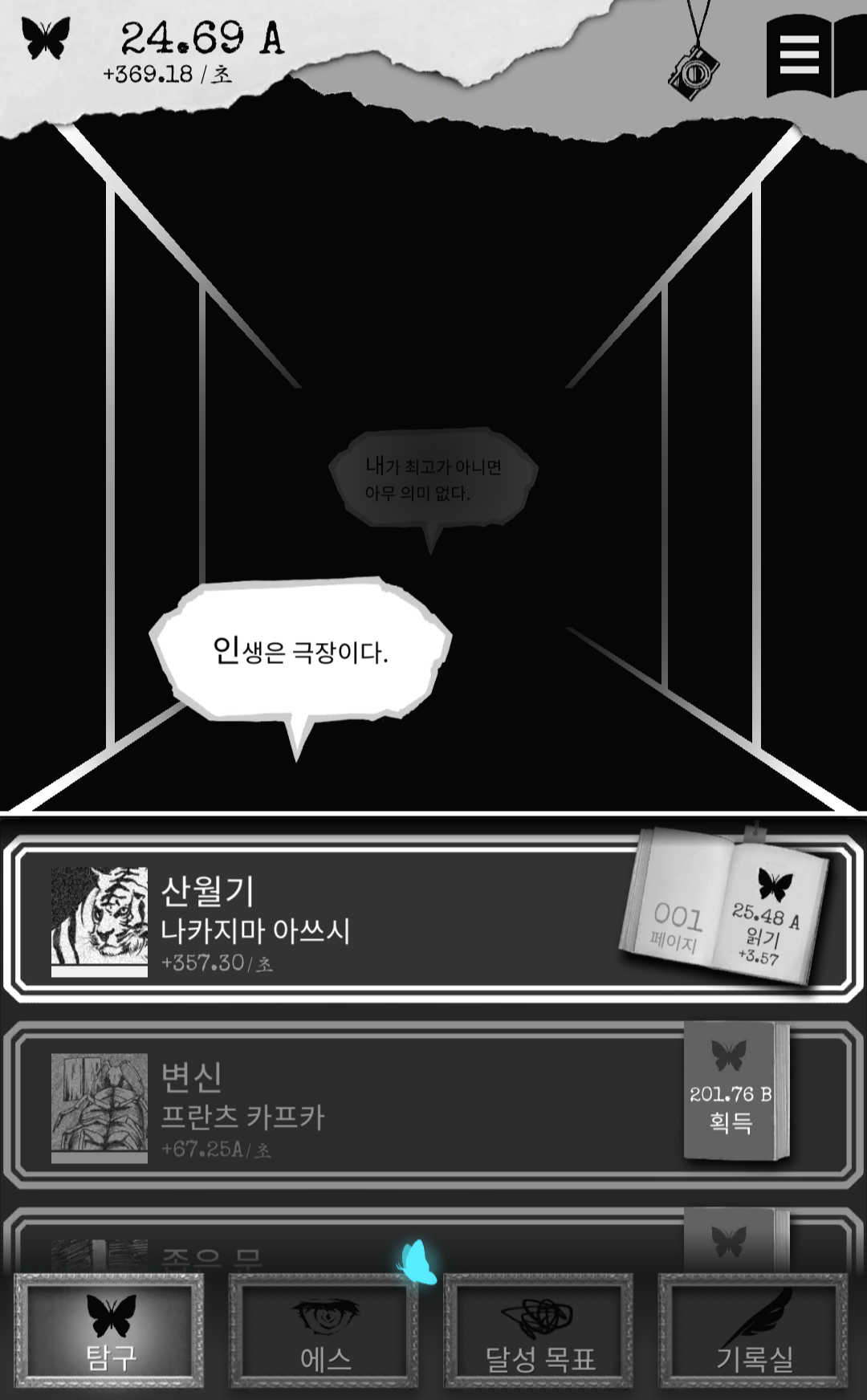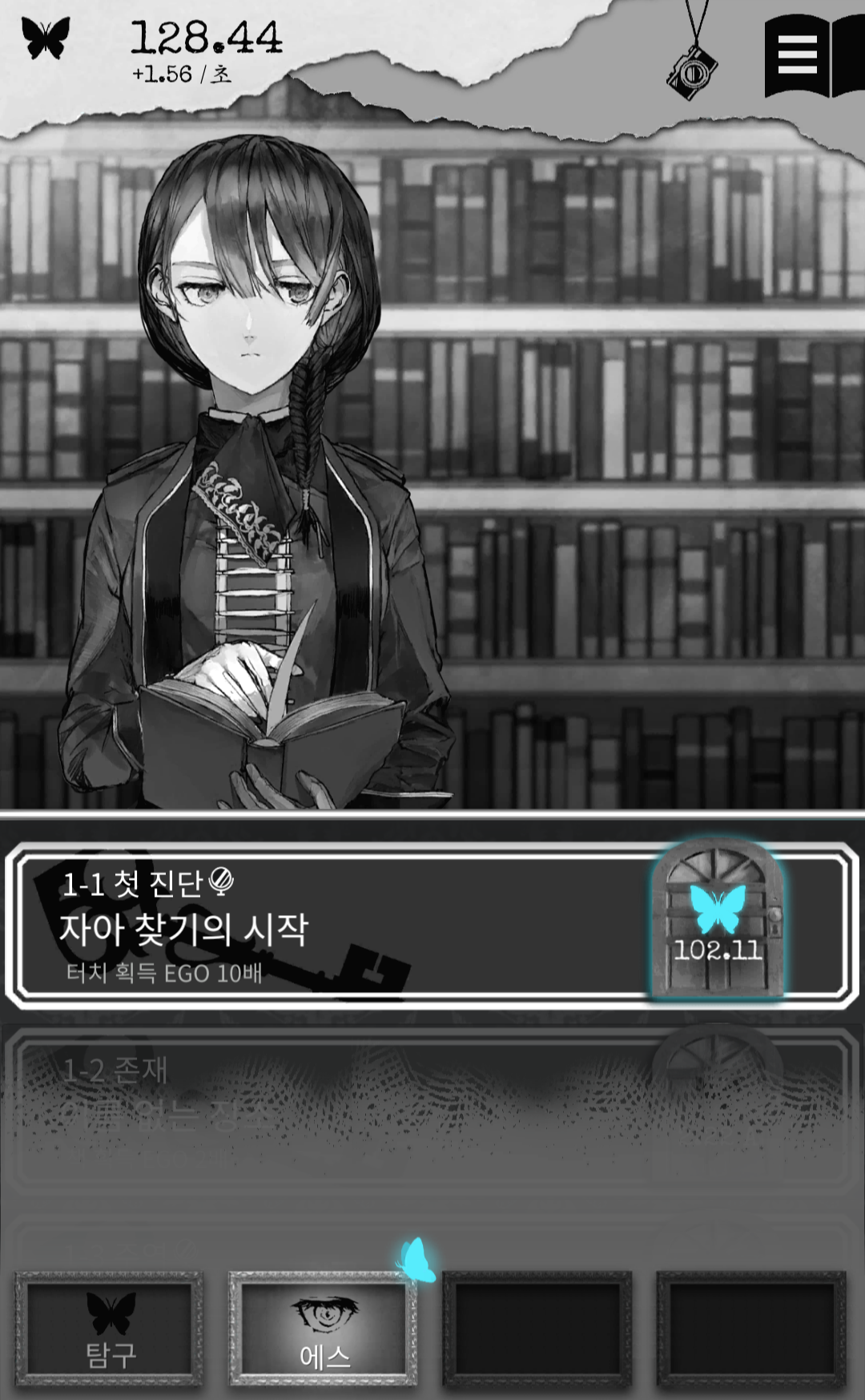게임을 하면서 터치로 얻는 에고는 5A인데 다음 책 값이 200B인걸 보니 계속하고 싶다는 마음이 안 들었습니다. 이 부분을 넘기는 사람은 엔딩까지 볼 것 같고 딱히 게임에 매력을 못 느낀다면 저처럼 여기서 그만두지 않을까 싶어요. 그리고 책을 가장 아래까지 내려보니 단위가 R까지 나오네요.