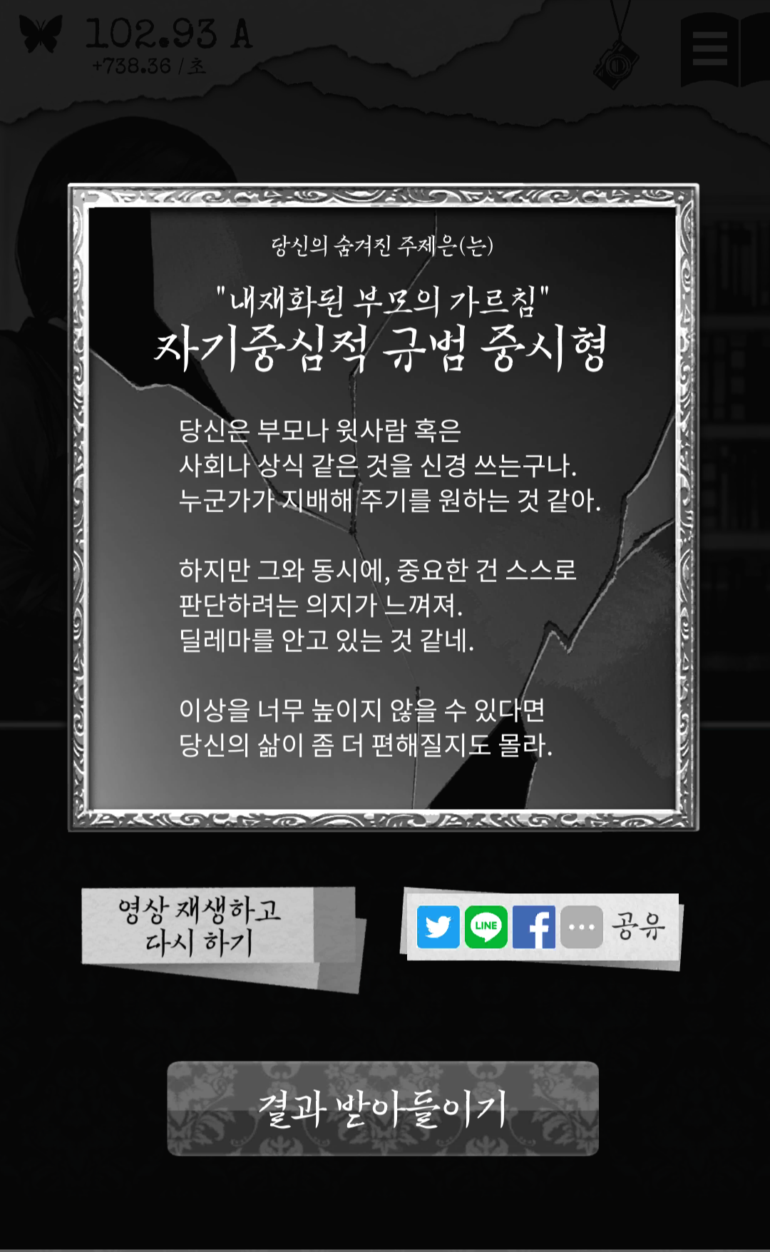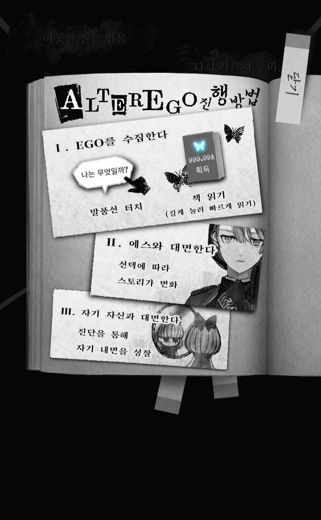 튜토리얼이 끝났는지 이제 본격적으로 게임 방법을 알려주네요. 말풍선을 터치해서 에고를 모으고 모은 에고를 소모하여 에스에서 심리테스트를 진행, 그리고 끝까지 진행하면 엔딩이 나오는 방식입니다.
