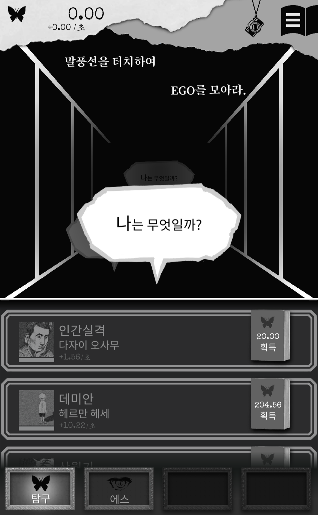 일정 포인트를 넘기니 '에스'라는 곳으로 가라고 하네요. 에스에서는 모은 에고를 소모하여 심리 테스트를 진행할 수 있습니다. 심리 테스트를 하면 아래 보이는 것처럼 터치 획득 에고가 증가합니다.