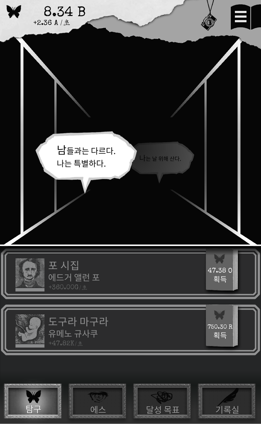 게임을 시작하니 말풍선이 점점 다가오는데 말풍선을 터치하여 게임 내 포인트인 '에고'를 모으고, 모은 에고로 책을 읽어 더 많은 에고를 모을 수 있습니다. 말풍선이 최대한 가까이 올 때 눌러야 가장 큰 포인트를 얻을 수 있으며 여기까지 보면 전형적인 방치형 게임이네요.