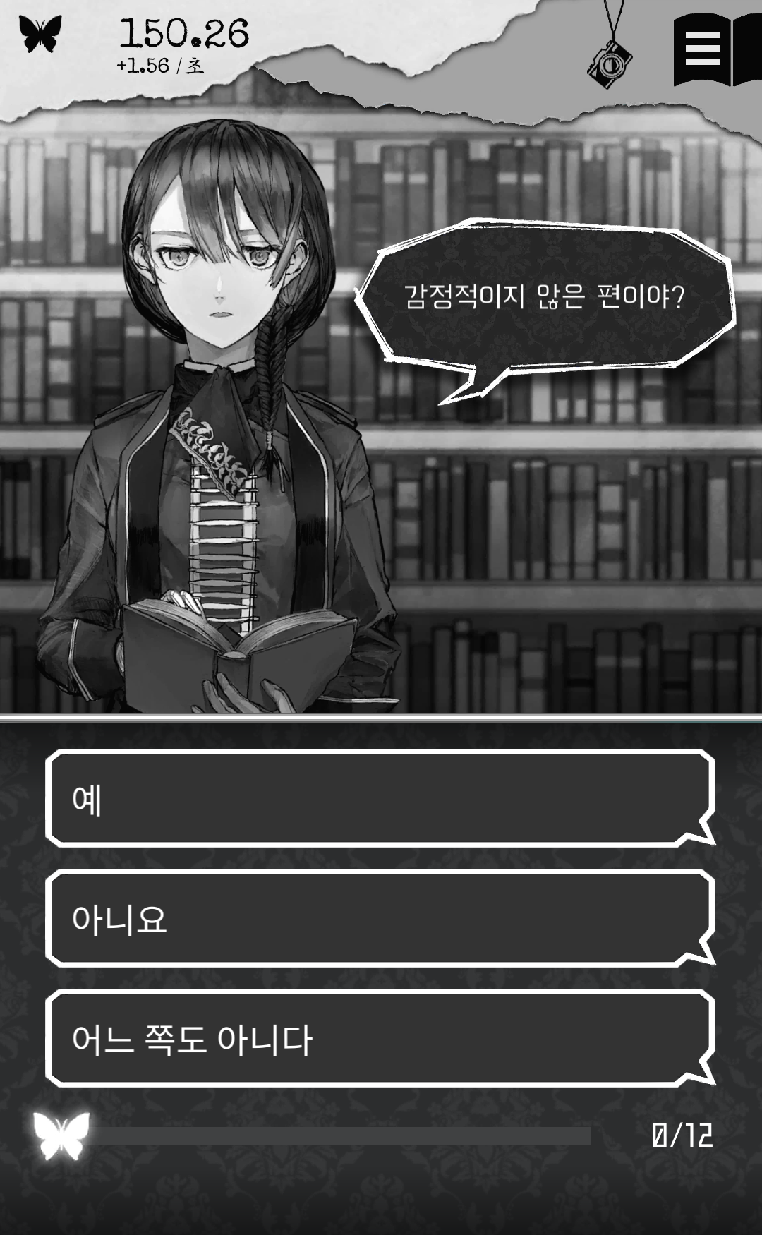 우선 평이 좋아서 받았고 엔딩이 정말 대단하다는 댓글이 많아서 궁금하긴 한데, 엔딩까지 가는 과정이 지루해서 그 과정을 감수할만한 게임으로 느껴지지 않습니다. 심리 테스트도 번역 게임이다 보니 제작자의 의도대로 완전한 번역은 아니라는 느낌을 받았고, 이게 정보 전달이 아니라 심리 테스트에 사용되는 부분에서 느꼈기 때문에 더더욱 아쉬웠습니다. 또, 방치형 게임이라 가만히 둬도 포인트는 알아서 오르지만, 자동으로 얻는 포인트보다 손으로 말풍선을 눌러서 얻는 포인트가 훨씬 크기 때문에 빠른 진행을 원한다면 눌러줘야 합니다. 그리고 방치형 게임의 또 다른 특징으로 한 번에 요구 포인트가 확 늘어나는데, 그 상황을 넘기느냐 마느냐에 따라 게임 지속 여부가 갈리겠네요. 저는 그 상황에서 그만뒀는데 느긋하게 즐기려는 분들에게는 나쁘지 않을 수 있겠습니다.