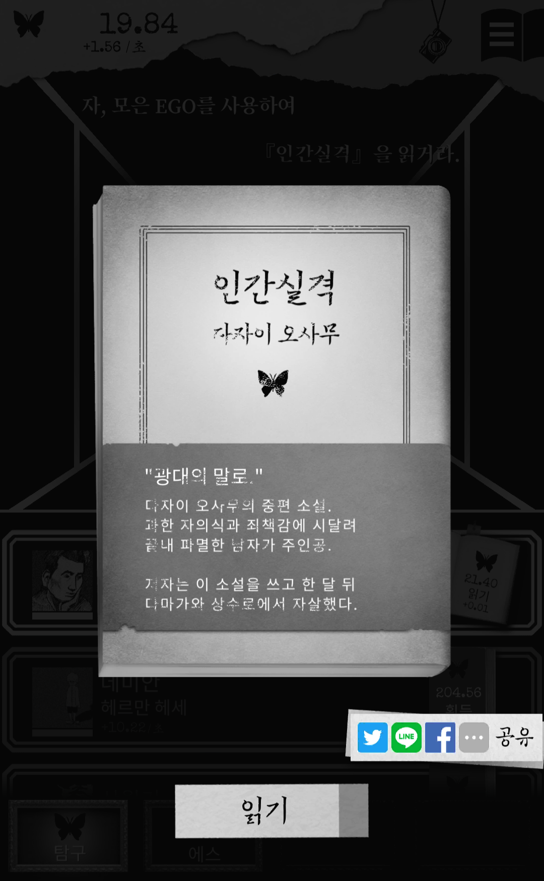 에고를 모아서 책을 읽으니 책에 대한 간단한 정보가 나옵니다. 읽기를 눌러도 내용은 나오지 않고 그냥 자동으로 얻을 수 있는 에고가 증가합니다.