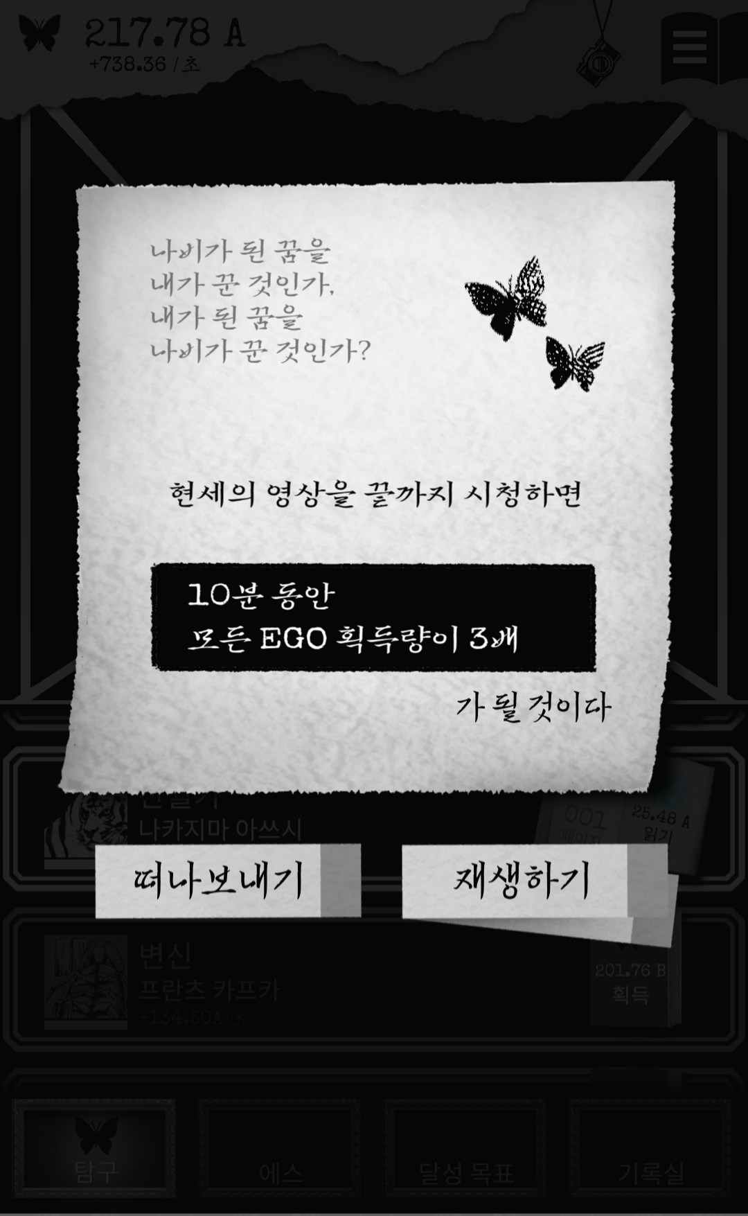 화면에서 가끔 파란 나비가 등장하는데 파란 나비를 누르면 광고를 보고 보상을 받을 수 있습니다. 보상은 랜덤인데 에고를 직접 주기도 하고, 사진처럼 일정 시간 얻는 에고 획득량을 늘려주기도 해요.