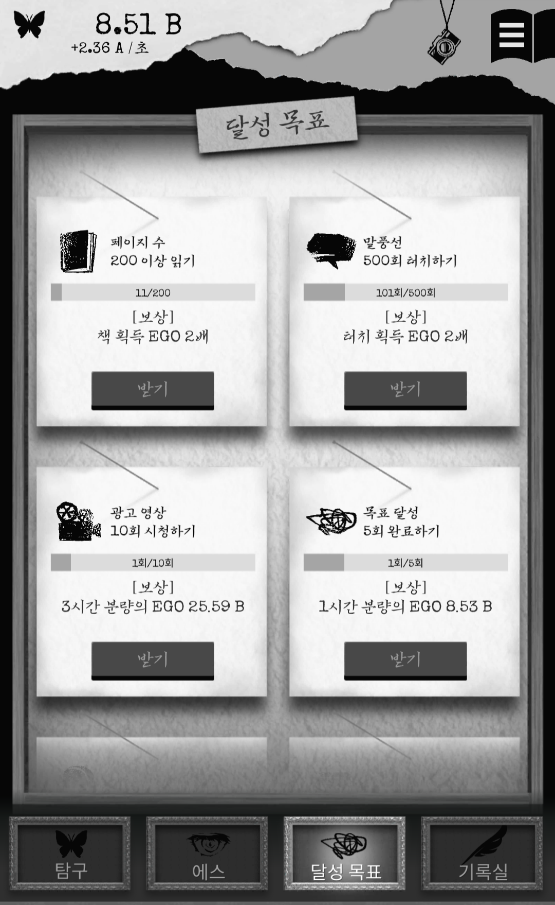 달성 목표를 보면 보상으로 에고를 받을 수도 있는데 보기만 해도 꽤 오랜 시간 해야 하는 게임이라는 걸 알 수 있습니다.