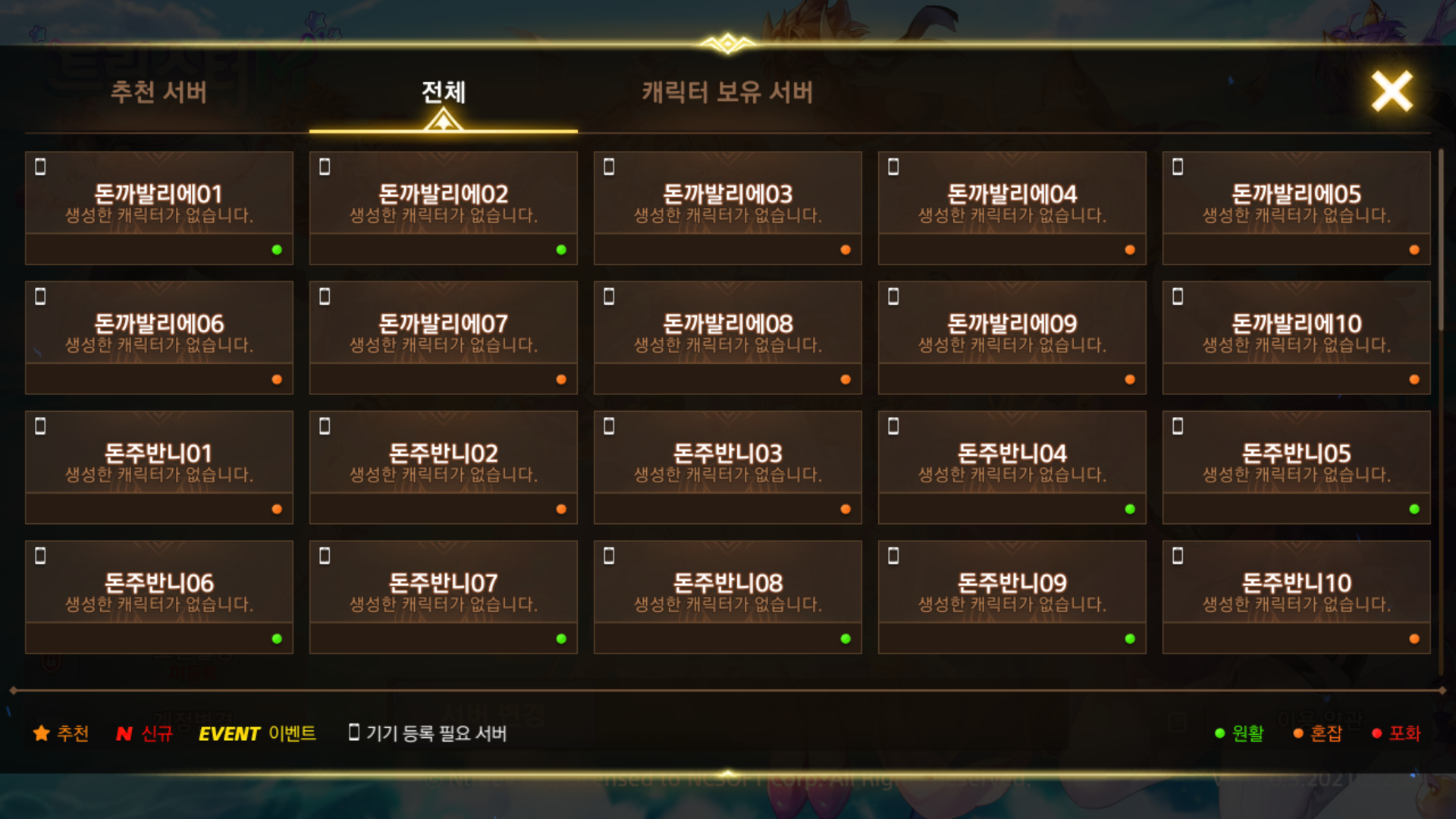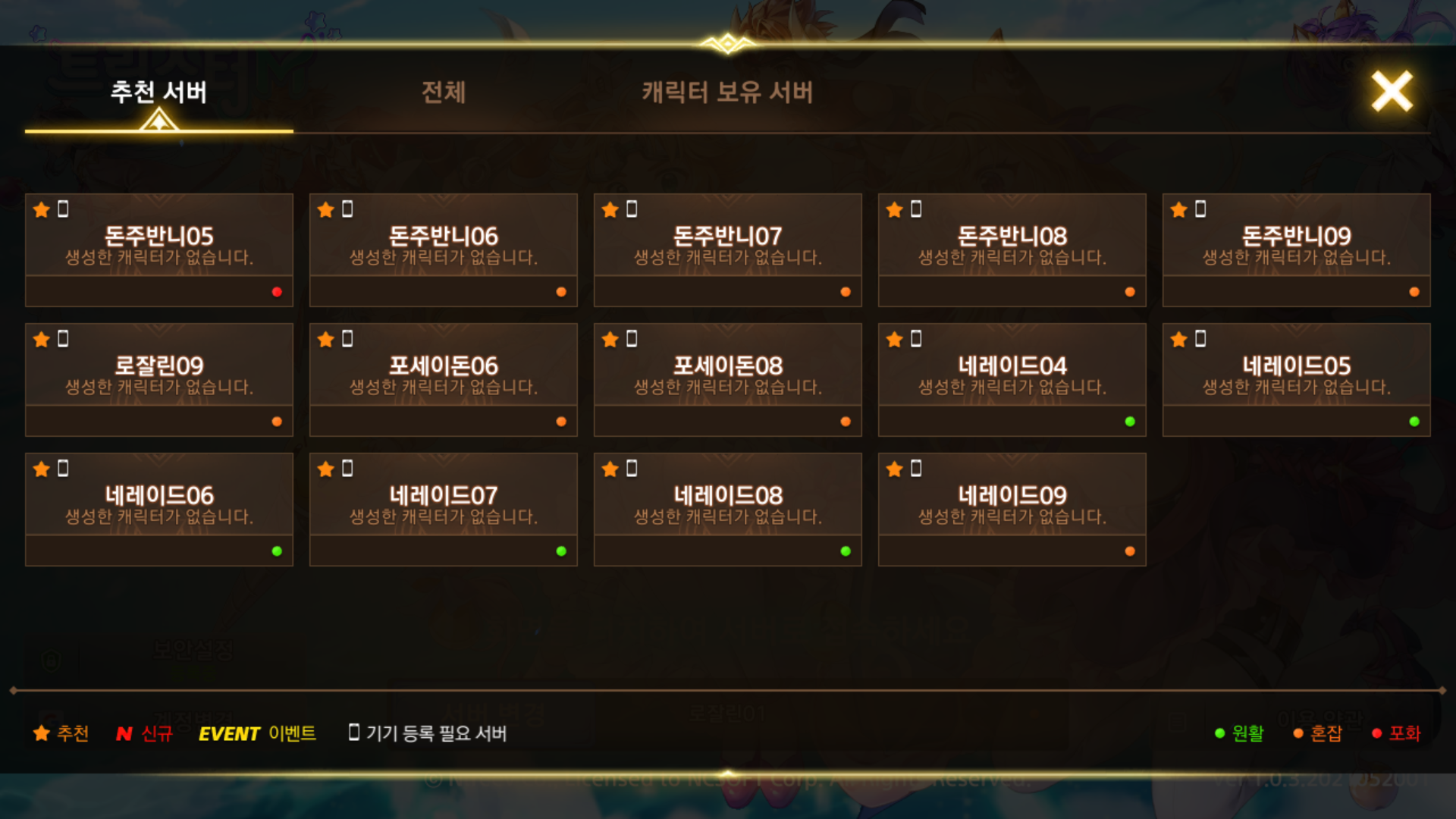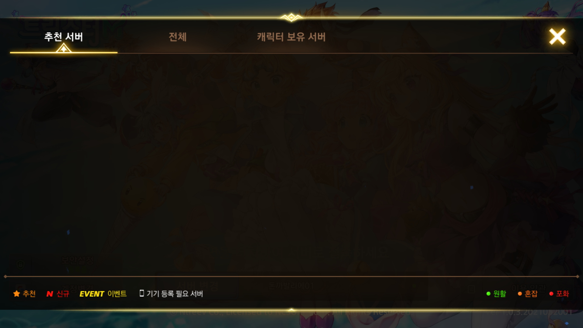 추천 서버가 없어서 왜 그런가 했더니 서버가 터졌나 봐요. 전체 서버에서 서버를 고르면 해당 서버는 캐릭터를 생성할 수 없다고 나옵니다.