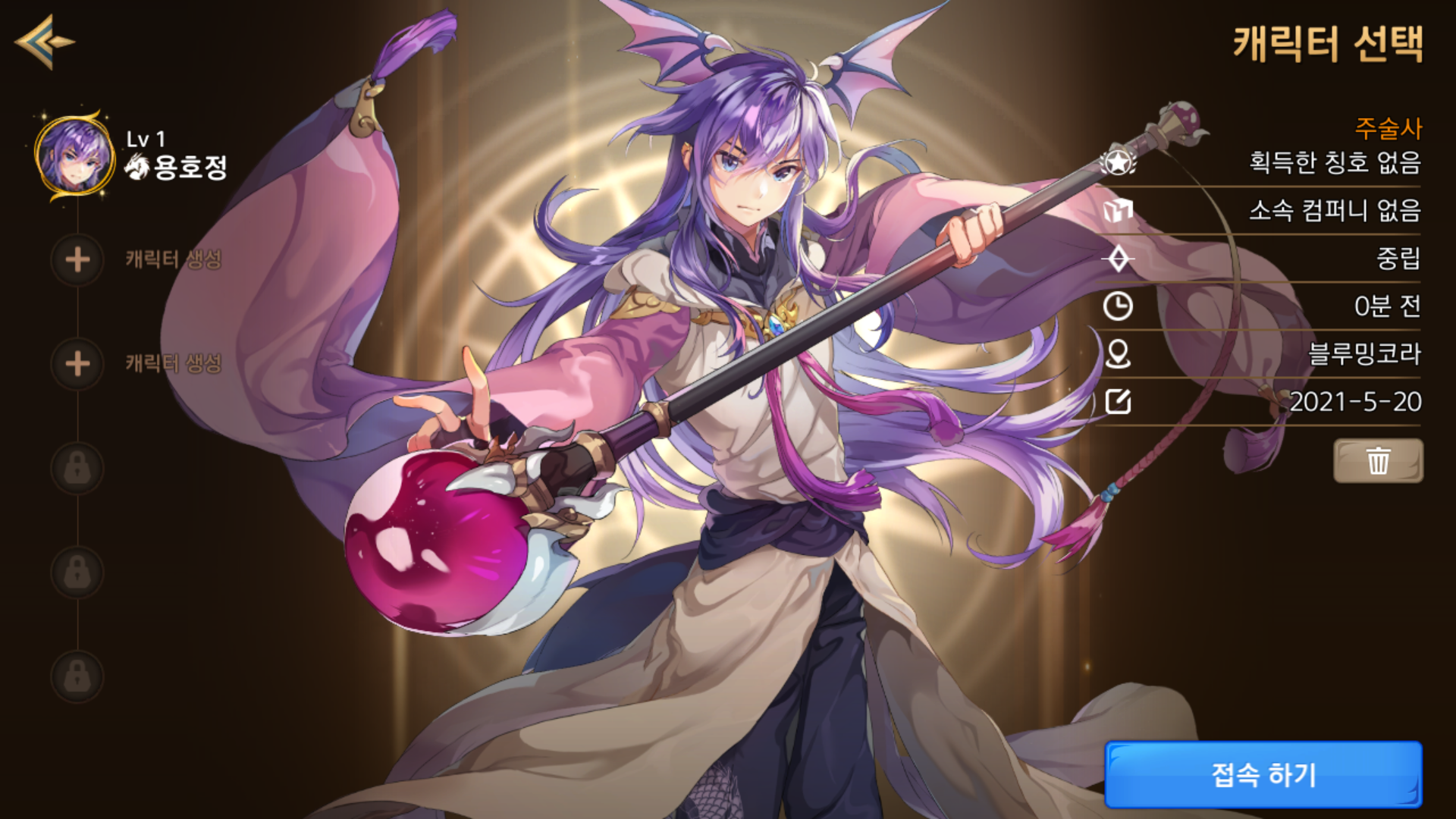 대충 버튼 몇 개만 눌러서 튜토리얼을 마치면 캐릭터를 생성할 수 있습니다. 끌리기는 전사로 보이는 첫 번째 캐릭터가 끌렸는데 사람이 많으면 필드 사냥에서 원거리가 좋을 것 같아서 주술사를 골랐습니다.