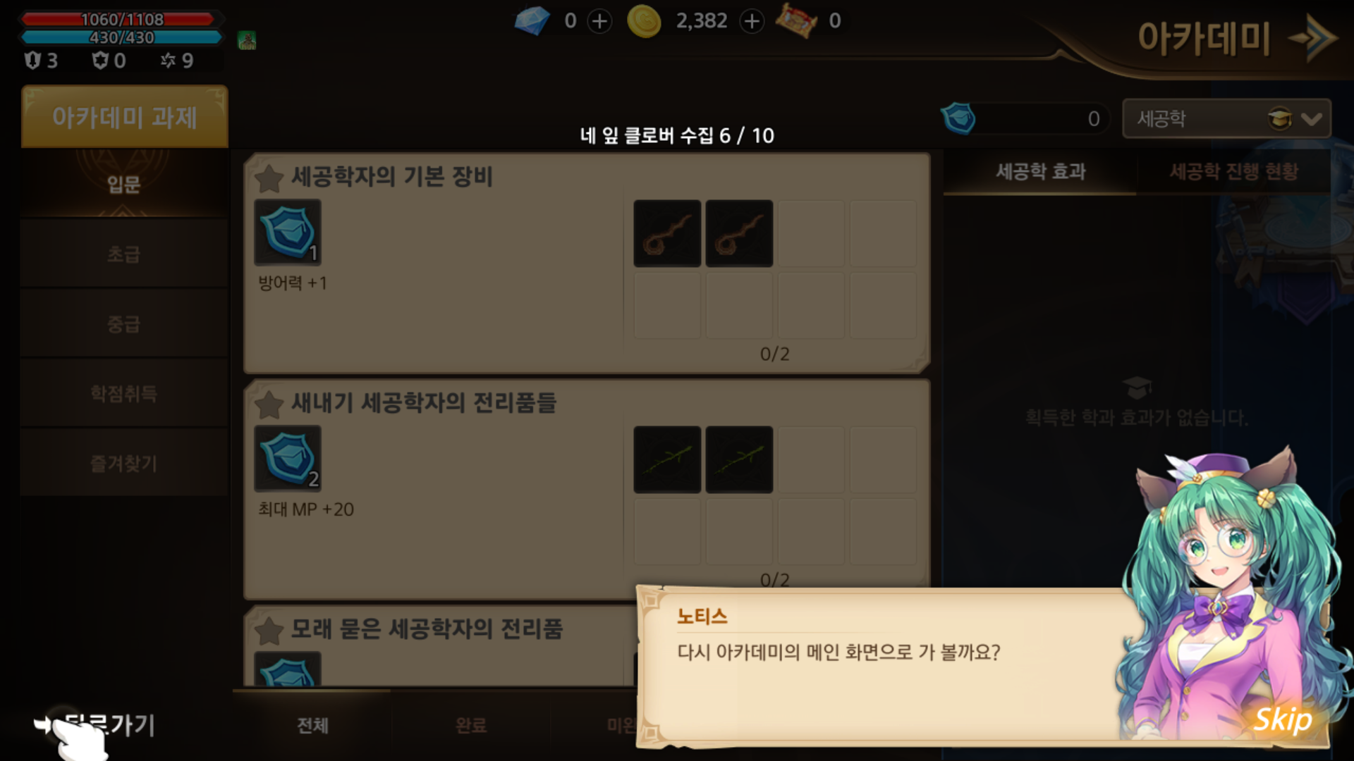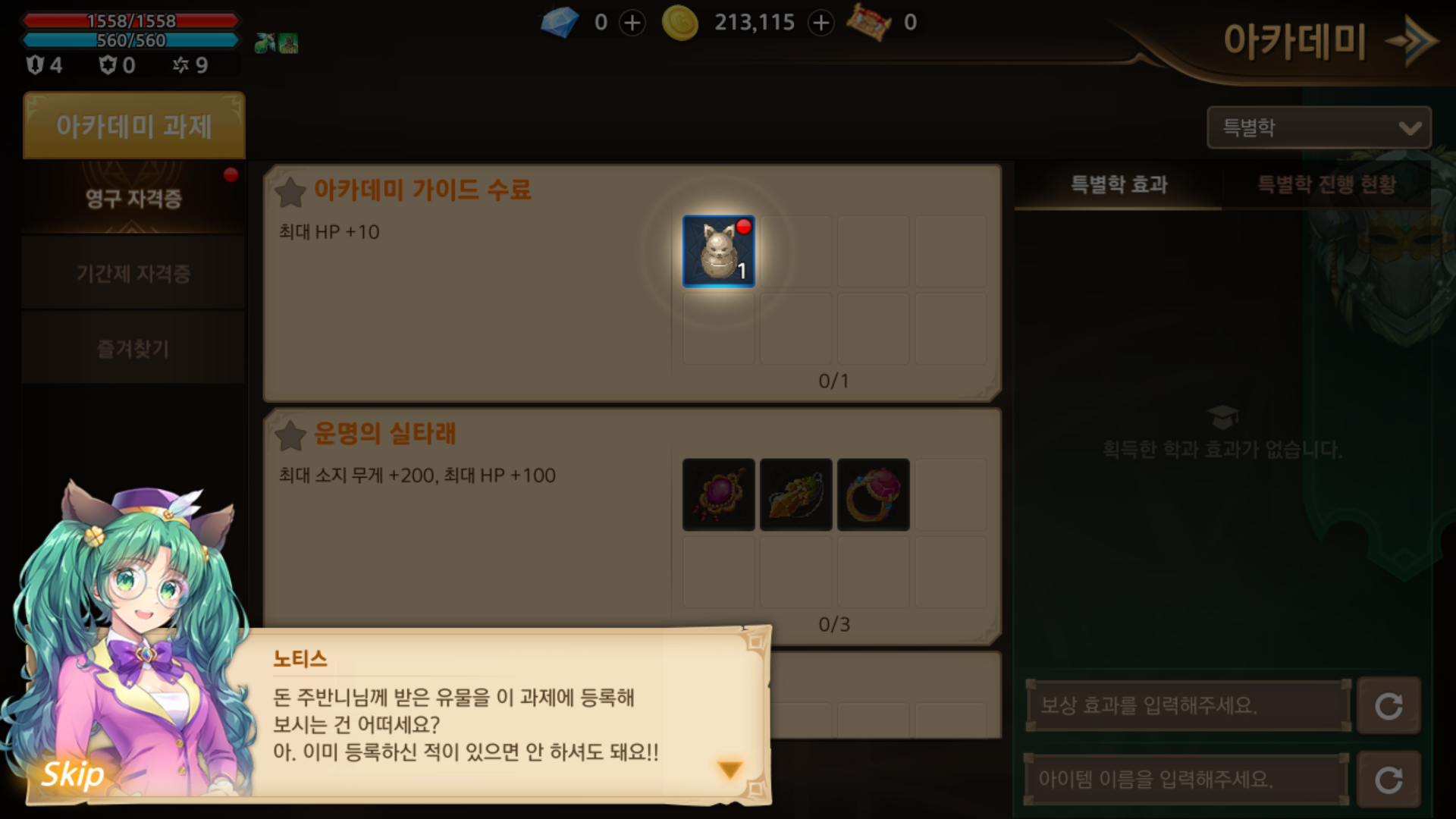 게임을 진행하다 보니 아카데미의 과제라는 게 있었는데 보통 게임의 도감에 해당하는 부분 같아요. 수집을 해서 스텟 효과를 받으려면 꽤 걸릴 것 같네요.