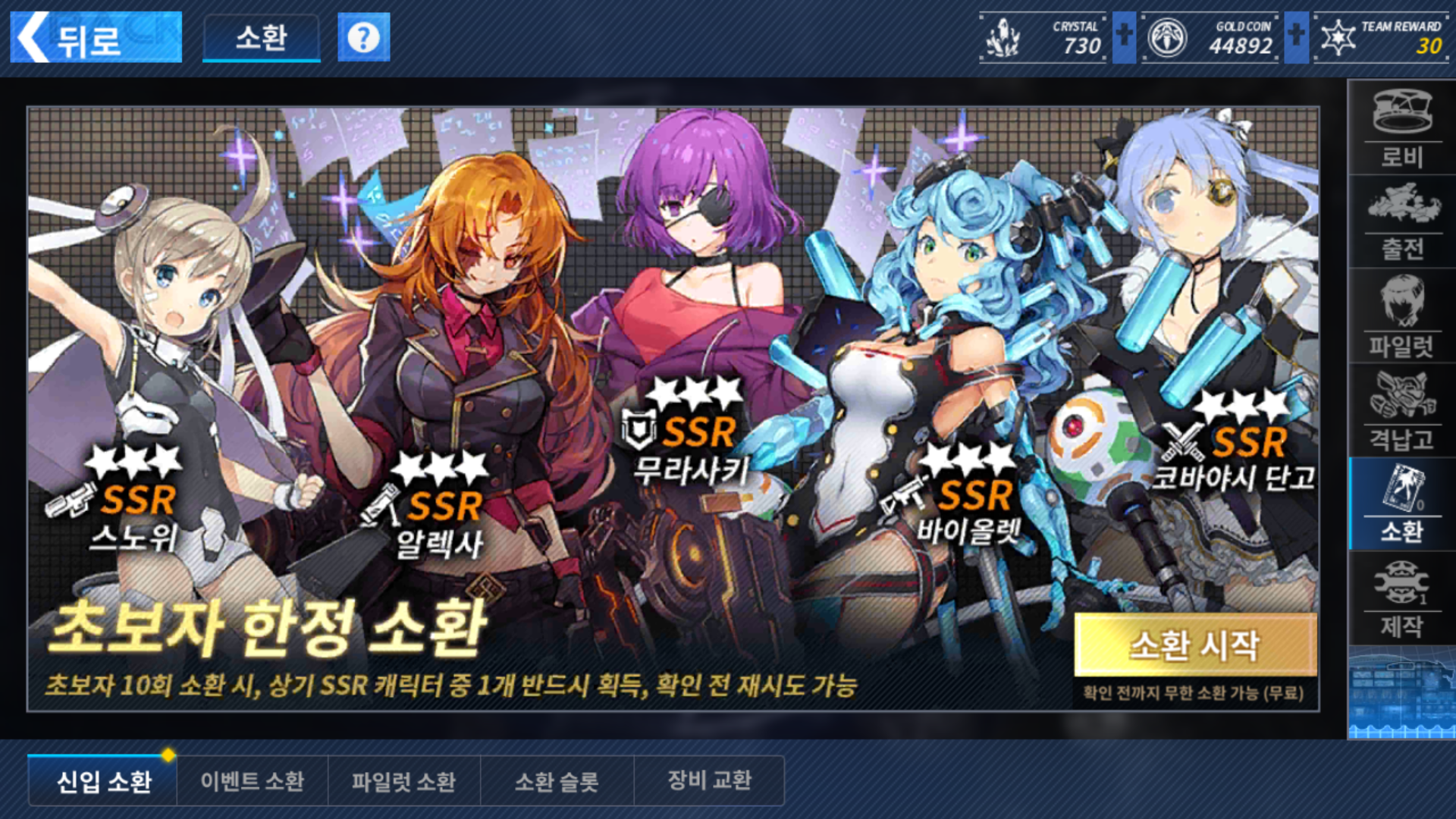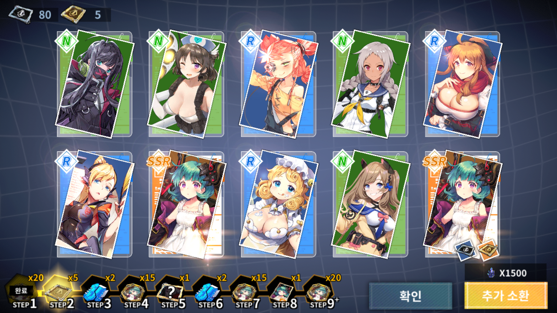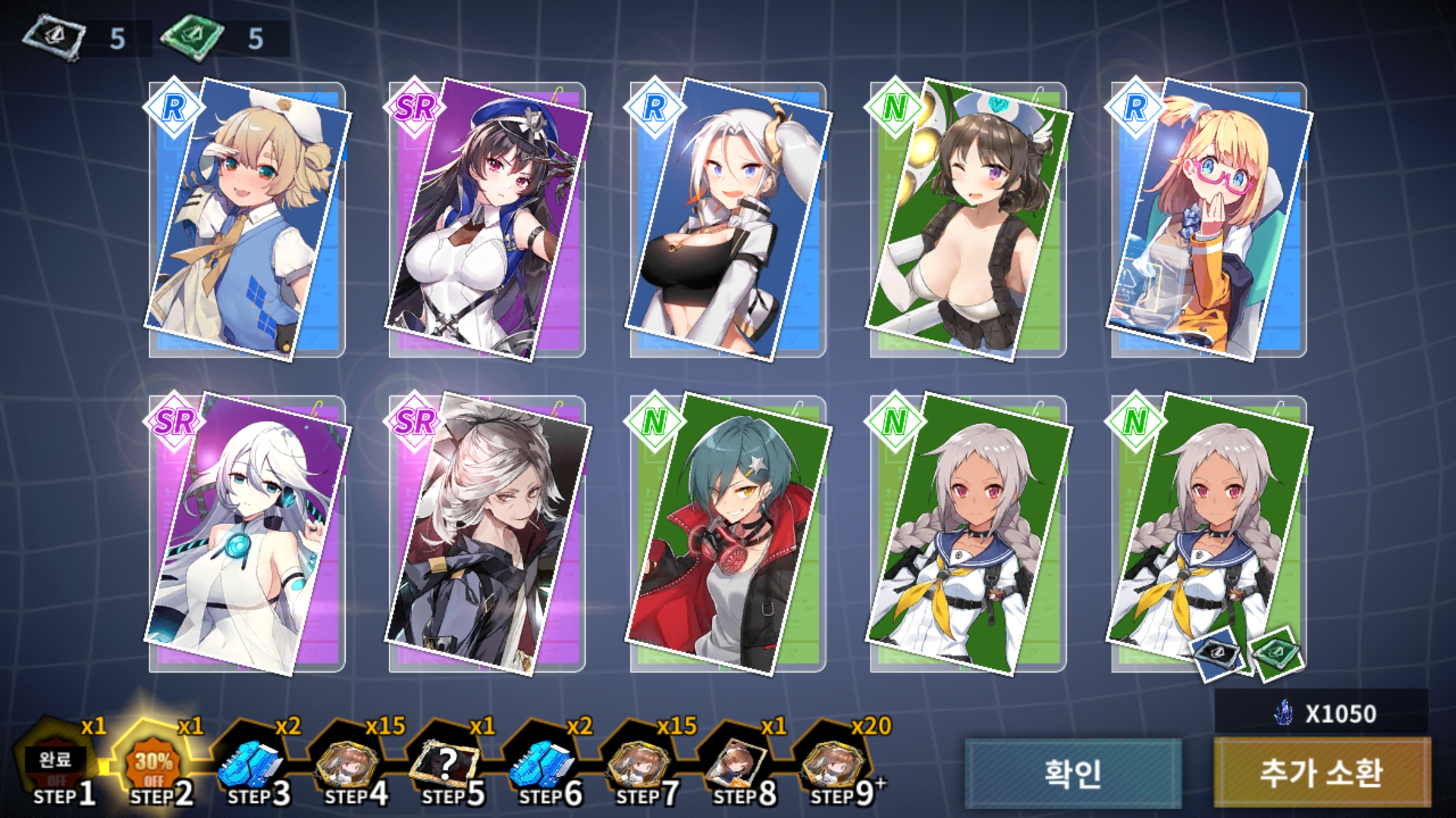 SSR 캐릭터 중 1개를 반드시 획득이라고 해서 1개 이상이 나오나 해서 돌려봤는데, 마지막 SR 2개와 SSR 1개는 위치 고정이고, 남은 7개가 N과 R 중에서 섞여 나옵니다. 저도 한 30번 이상 돌려본 거라 두 개는 안 뜰 것 같아요. 그래서 SR 중에서 1 티어 2개를 제외하면 그나마 높은 게 2 티어라서 없는 2 티어가 나왔을 때 확정했습니다.