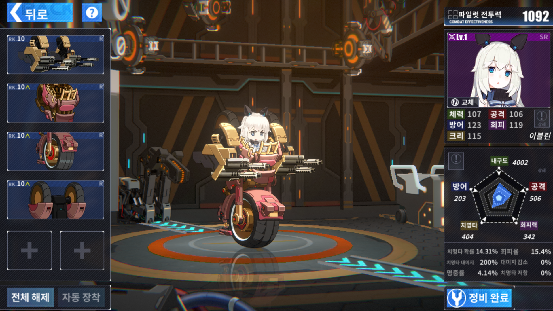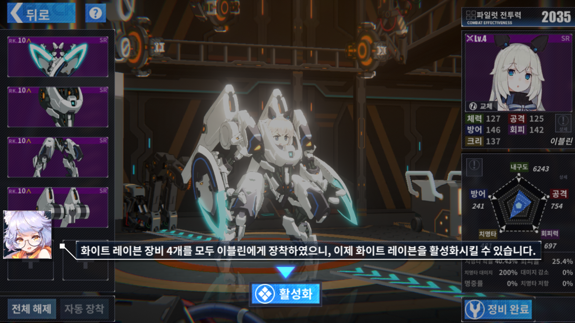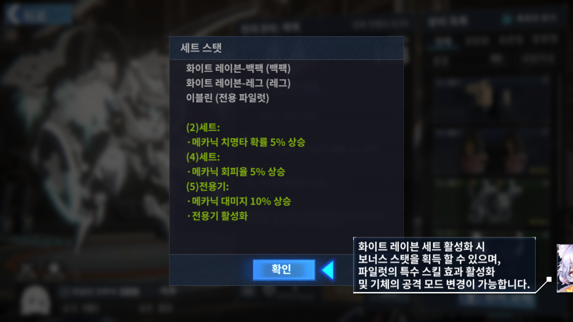 세트를 착용하면 이런 효과를 얻게 되고, 해당 장비를 전용 파일럿이 착용할 경우 부가 효과가 주어집니다. 기본으로 주는 캐릭터가 전용 장비까지 지급해주니 초반에 사용하기에 좋아 보입니다.