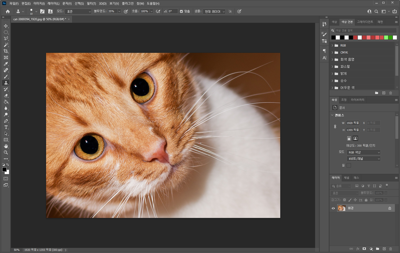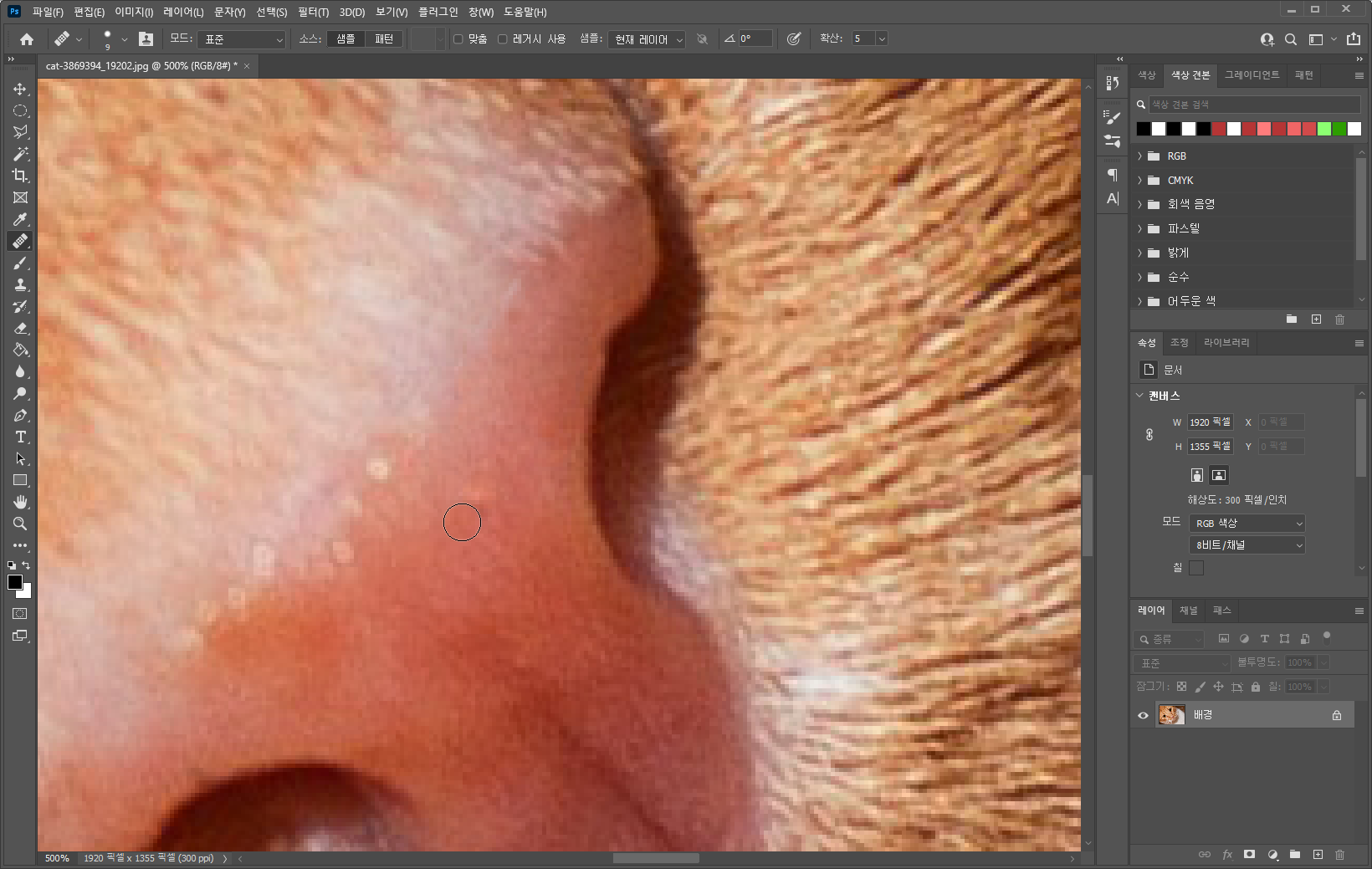 우선 사진 하나를 불러왔는데 코에 점 두 개가 있으니 저걸 지워보겠습니다. 단순한 작업 같아도, 고양이 코 색이 상당히 얼룩덜룩해서 손이 많이 가겠네요.