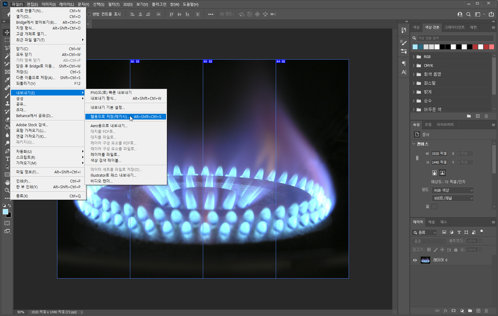 영역을 나누는 작업이 끝났다면 저장을 해야 하는데, 내보내기 > 웹용으로 저장(단축키 Alt + Shift + Ctrl + S)을 선택해주세요.