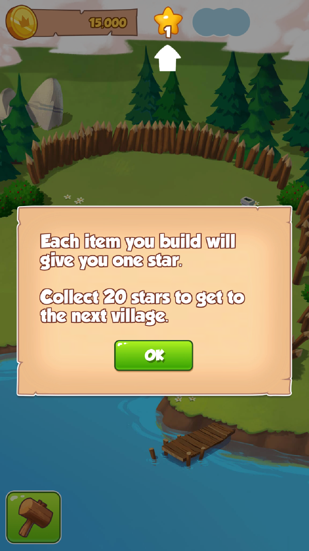 처음 게임을 시작하면 설명이 나오는데, 읽어보니 건물을 지어서 별을 얻고 20개를 모으면 다음 마을로 간다는 이야기네요.