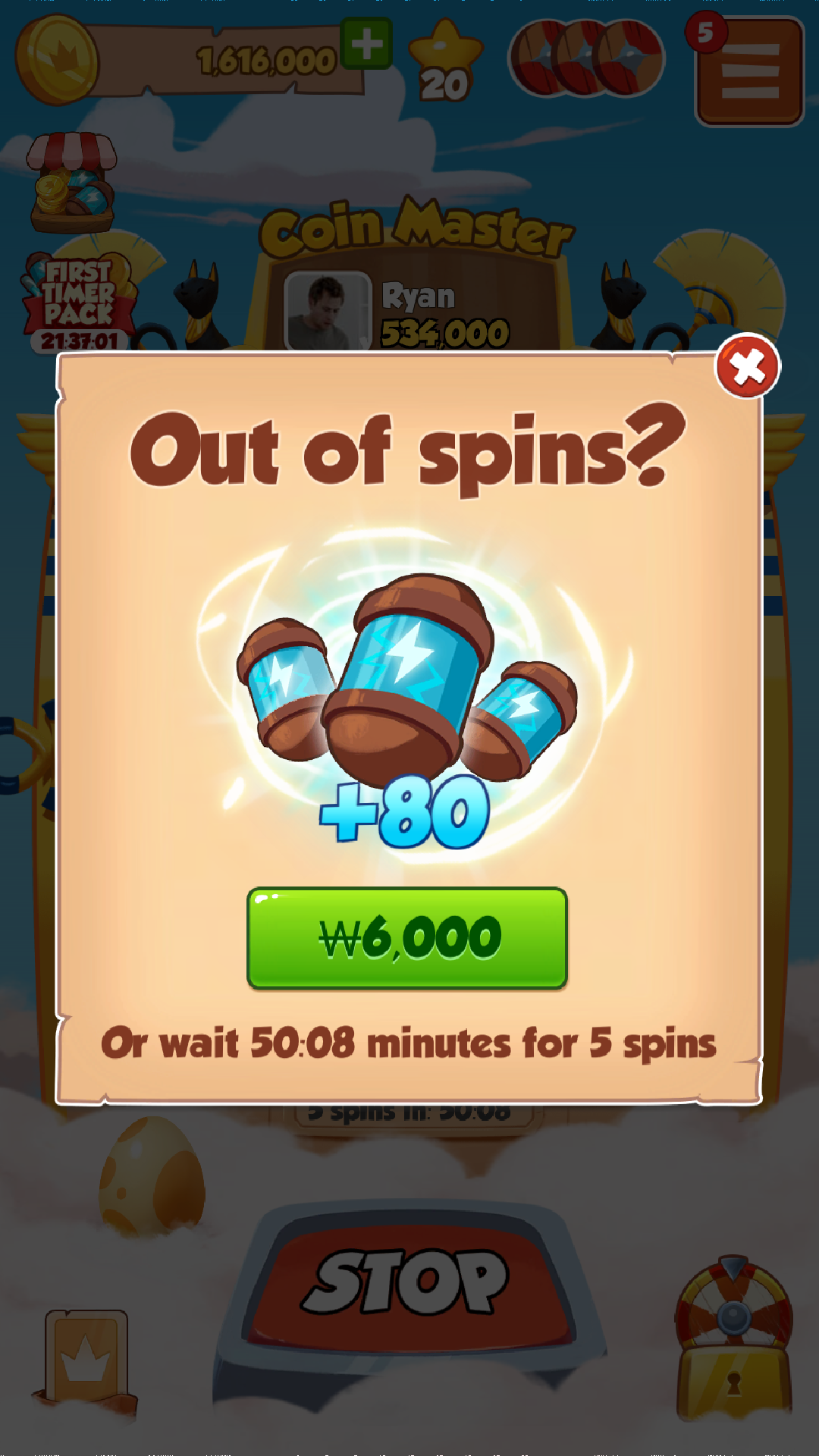 왜 매출 1위인가 했더니 조금 재밌어지나 싶을 때 스핀을 다 소모했고, 스핀을 소모하자마자 팝업창으로 스핀을 팝니다. 6천 원에 80개인데, 일반 게임 과금에 비해 비싼 금액은 아니지만 80개를 소모하는 시간을 생각하면 비싸네요.
