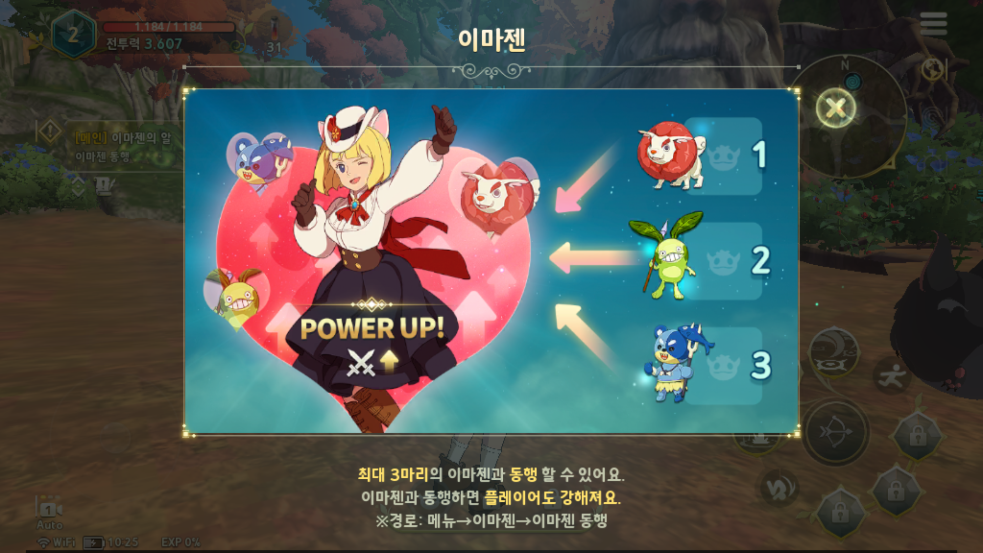 펫에 해당하는 '이마젠'입니다. 플레이어의 레벨에 따라 3마리까지 장착 가능하고 장착 시 전투력 증가와 도움을 주는 스킬도 사용합니다.