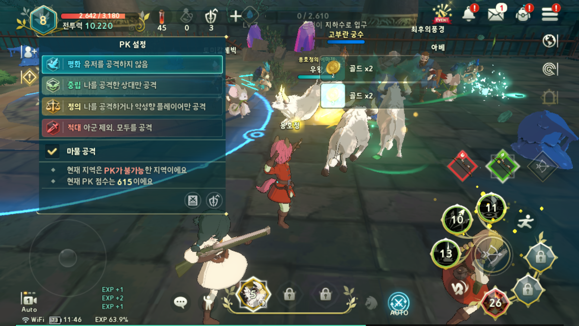 PK 설정 부분입니다. 나중에 PK 가능 지역에 가면 힘들 수도 있겠으나 초반 지역은 PK가 불가능한 지역으로 설정하여 기본적인 유저 보호장치가 있습니다.