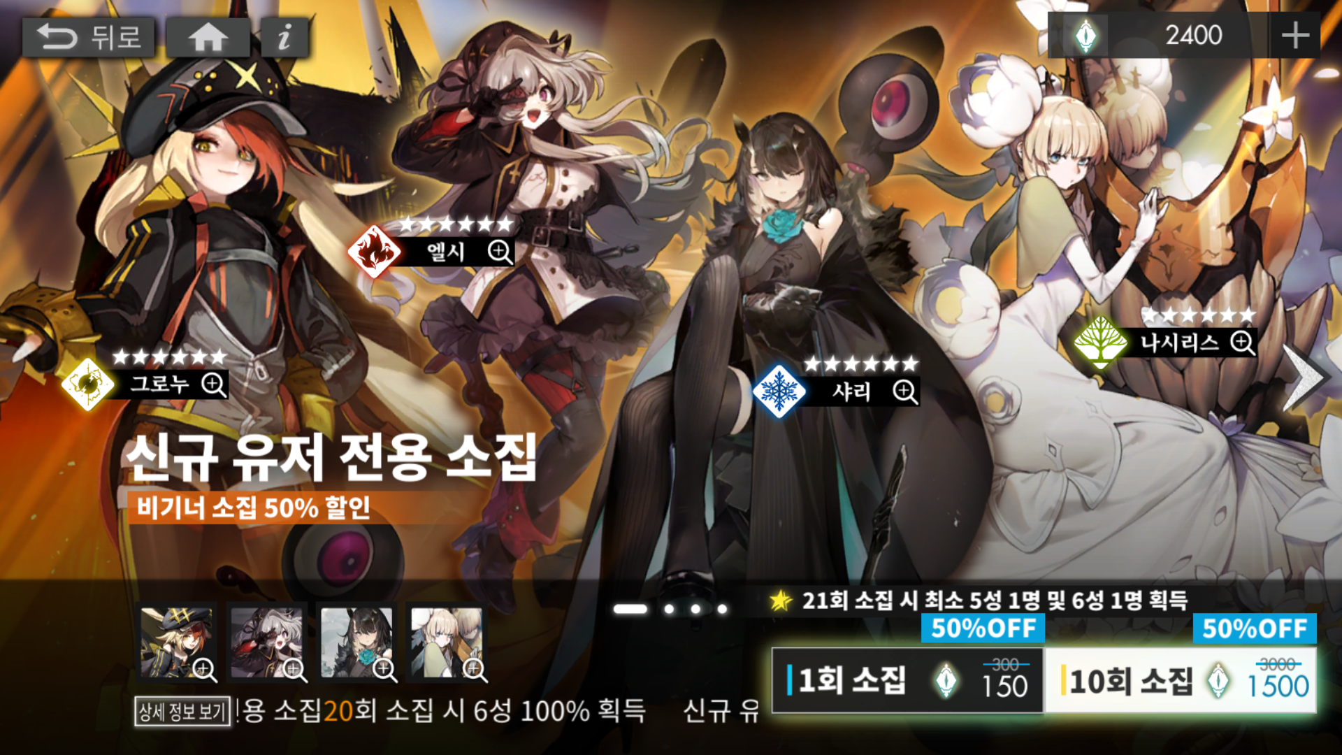 신규 유저 전용 소집도 있습니다. 10회 소집을 두 번 하면 위에 있는 네 개의 6성 중 하나가 무조건 나온다고 하네요.