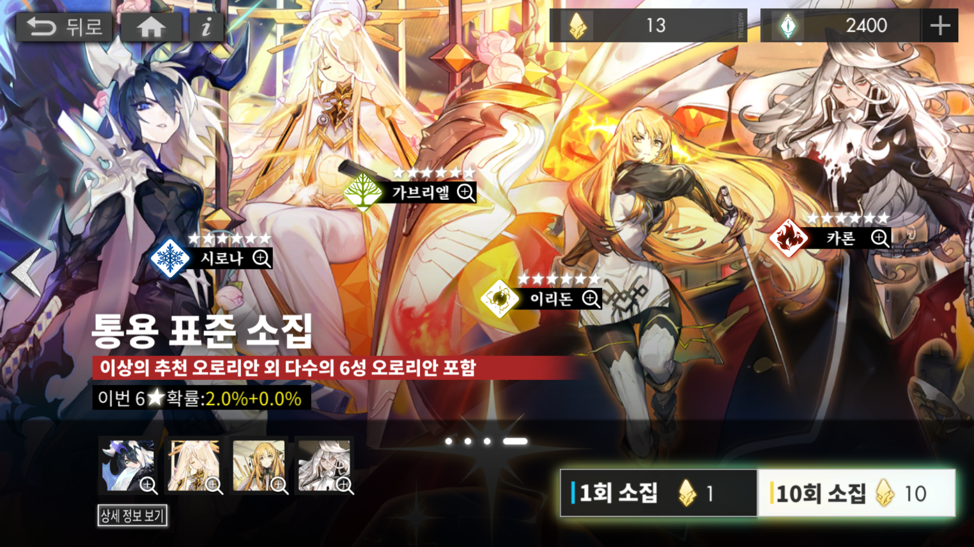 이건 오로리안 소환 화면인데 2% + @가 있는 걸 보면 6성이 안 나오면 확률이 증가할지도 모르겠네요.