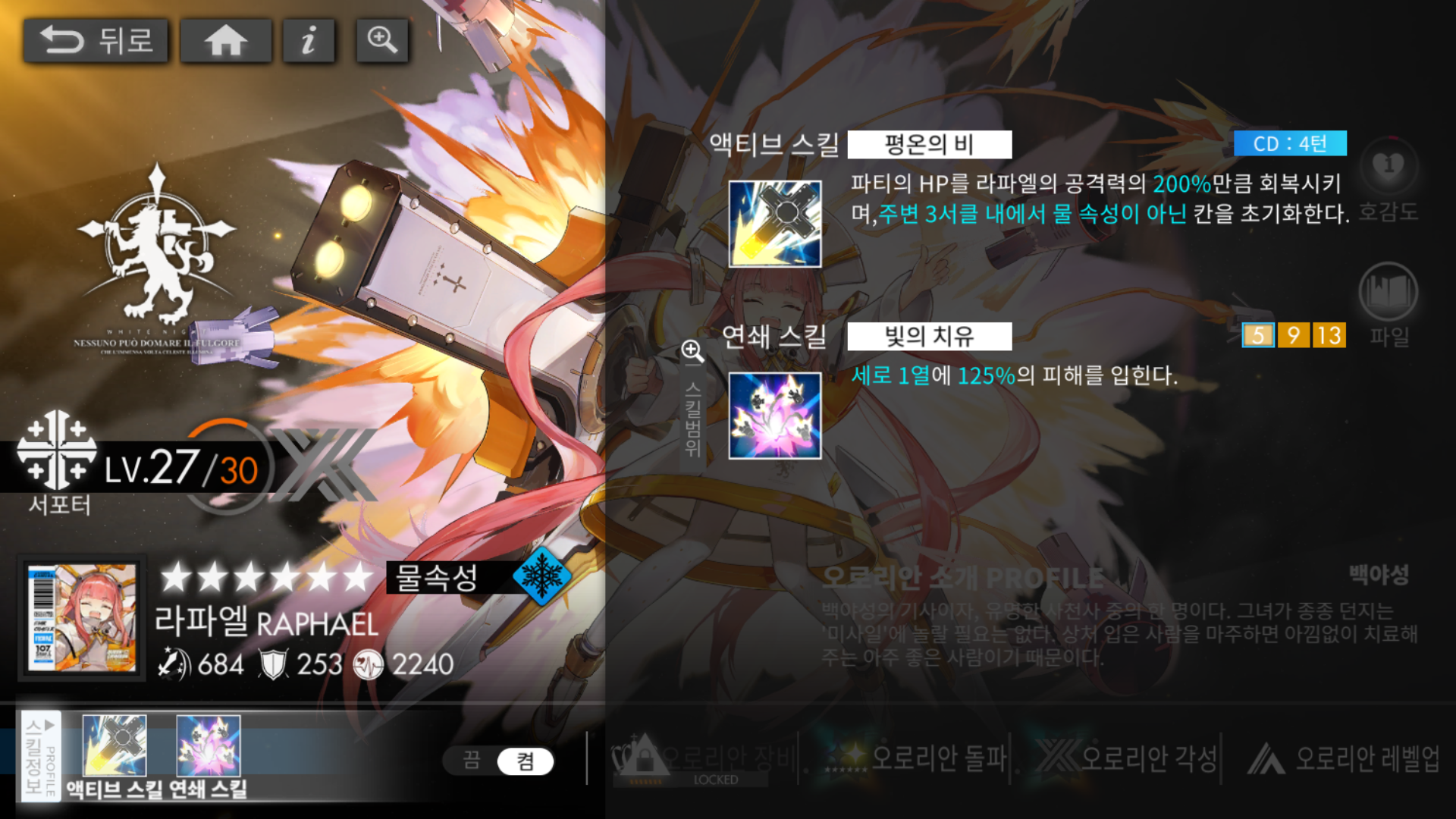 라파엘은 좋다고 하는데 써보니까 힐러로는 애매하네요. 힐보다는 연쇄 스킬이 13 타일이 되면 꽤 대미지가 높은데 그래서 평가가 좋은 건가 싶어요. 각성을 하면 회복이 좋네요.