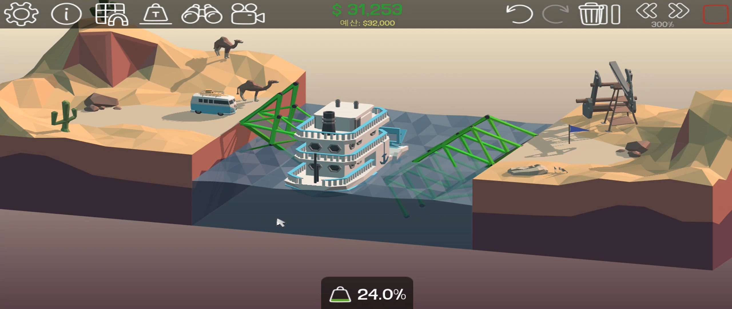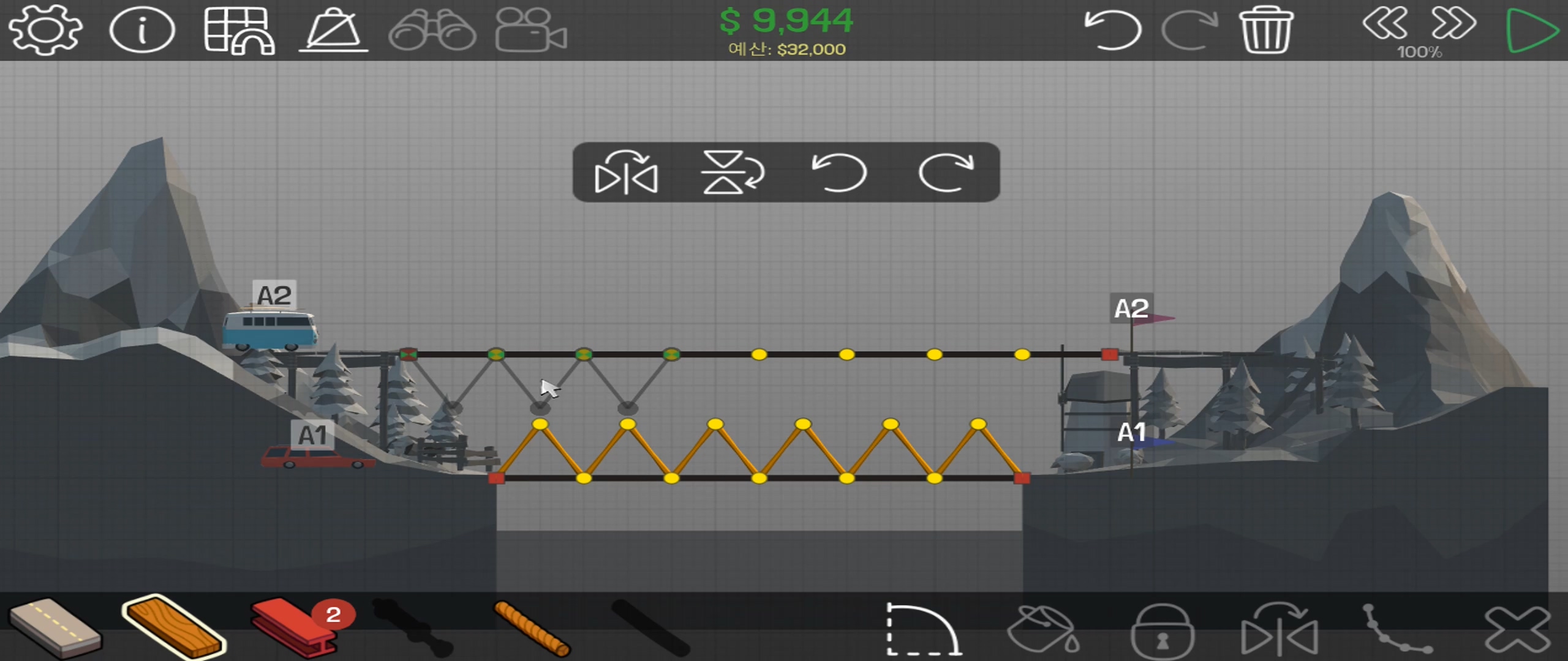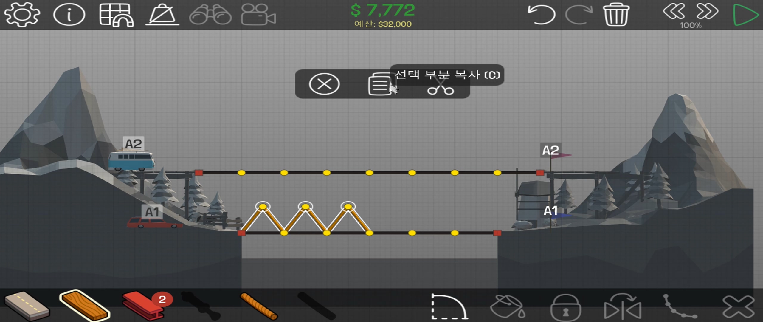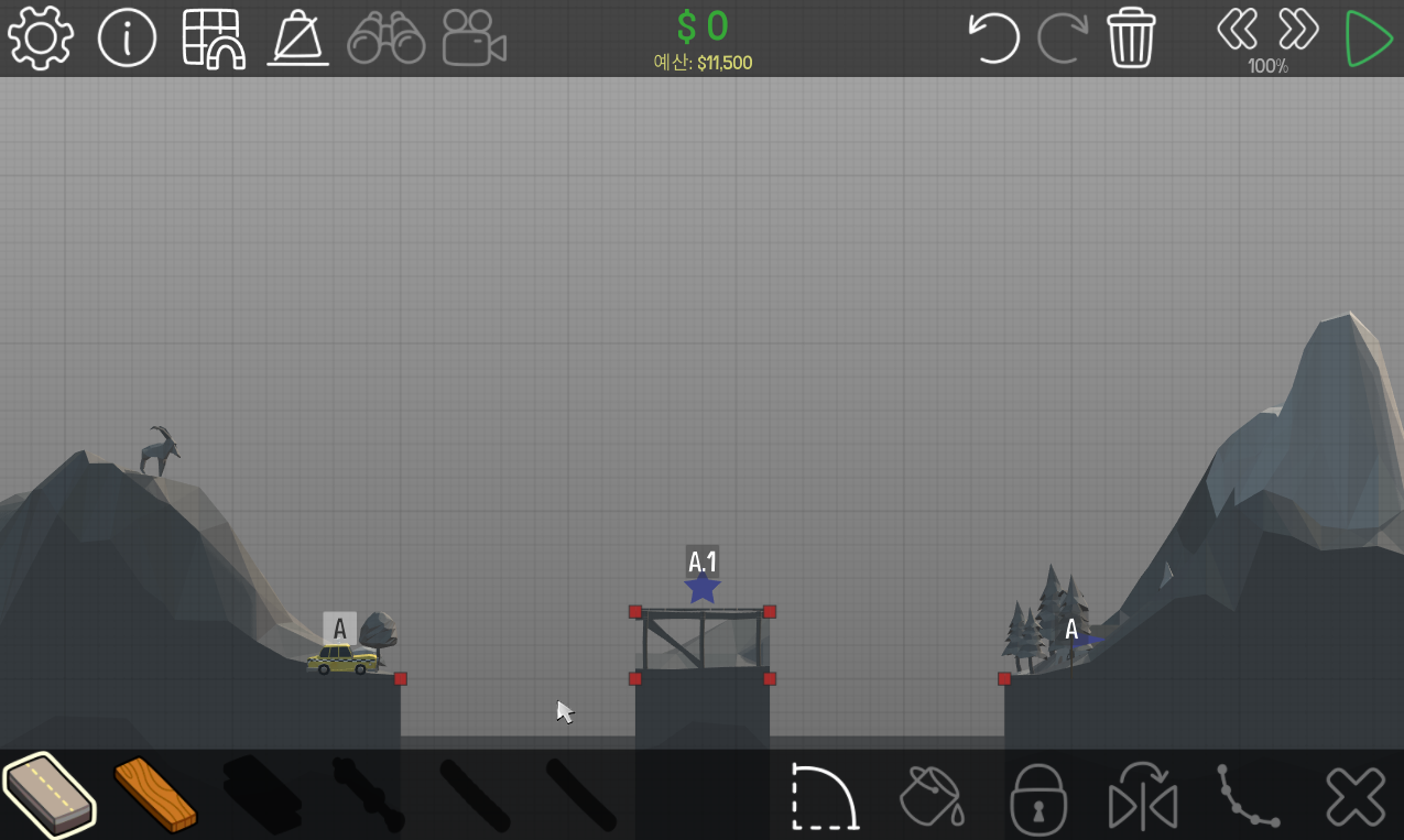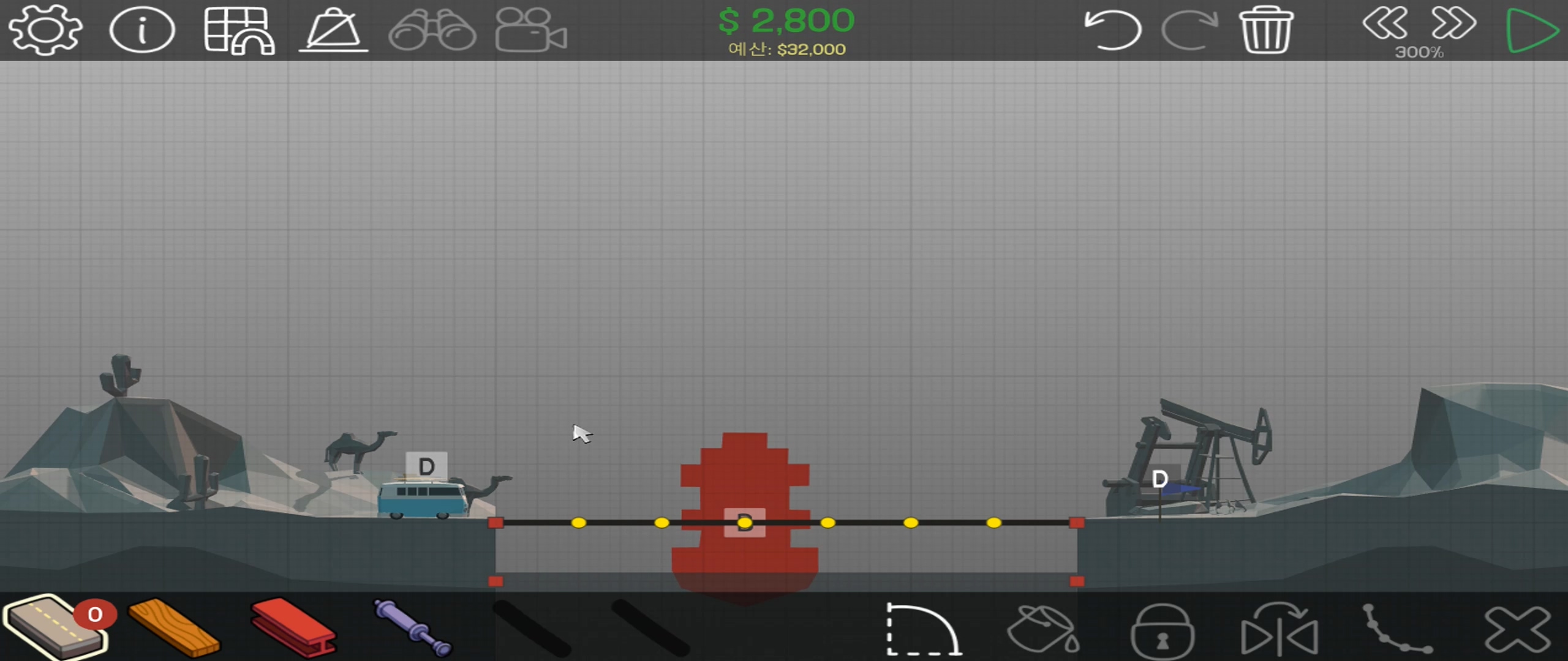 예전에 플레이하던 게 있어서 여기부터 플레이네요. 차량이 건너편으로 갈 수 있도록 다리를 지어주면 되는데 빨간 부분이 고정점이고 왼쪽 아래 도구에서 도로, 나무, 철근, 유압장치, 로프, 케이블 등을 사용해서 다리를 지으면 됩니다. 그리고 스테이지마다 사용할 수 있는 종류 및 개수에서 제한사항이 있습니다.