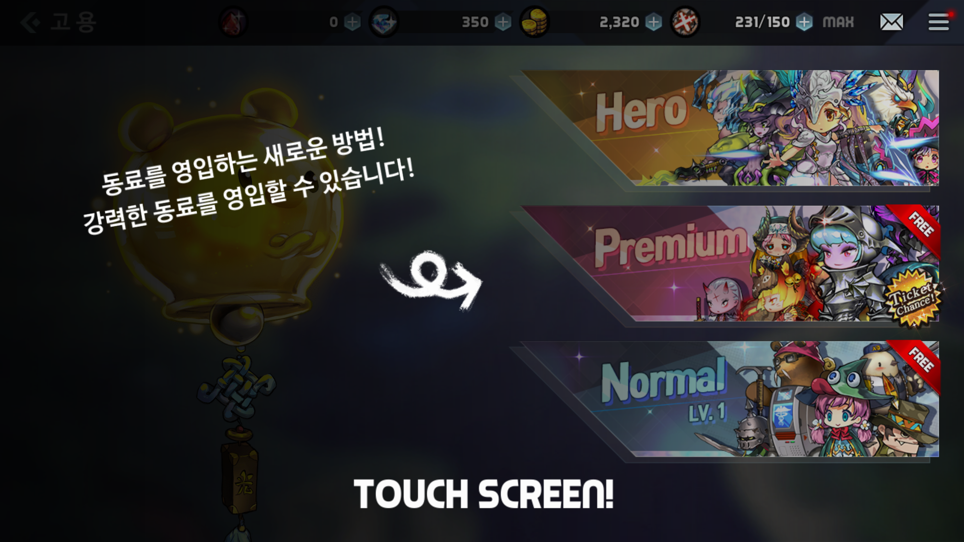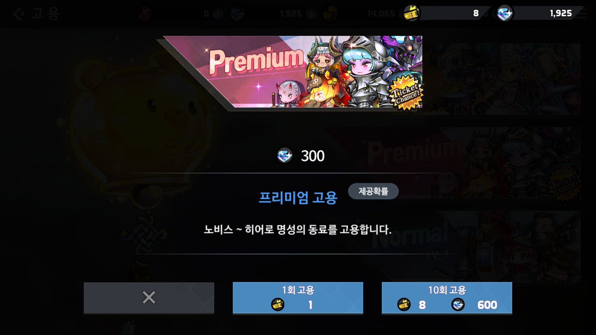 게임을 조금 플레이하다 보니 뽑기를 통해 동료를 영입할 수 있는데 히어로 뽑기는 과금을 해야만 할 수 있고, 과금을 하지 않는다면 게임 내 골드로 뽑는 노말 뽑기와 다이아로 뽑는 프리미엄 뽑기만 할 수 있습니다.