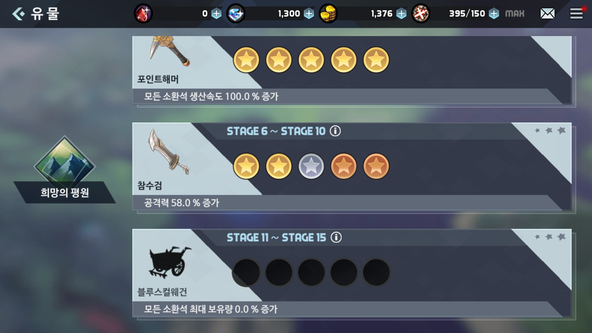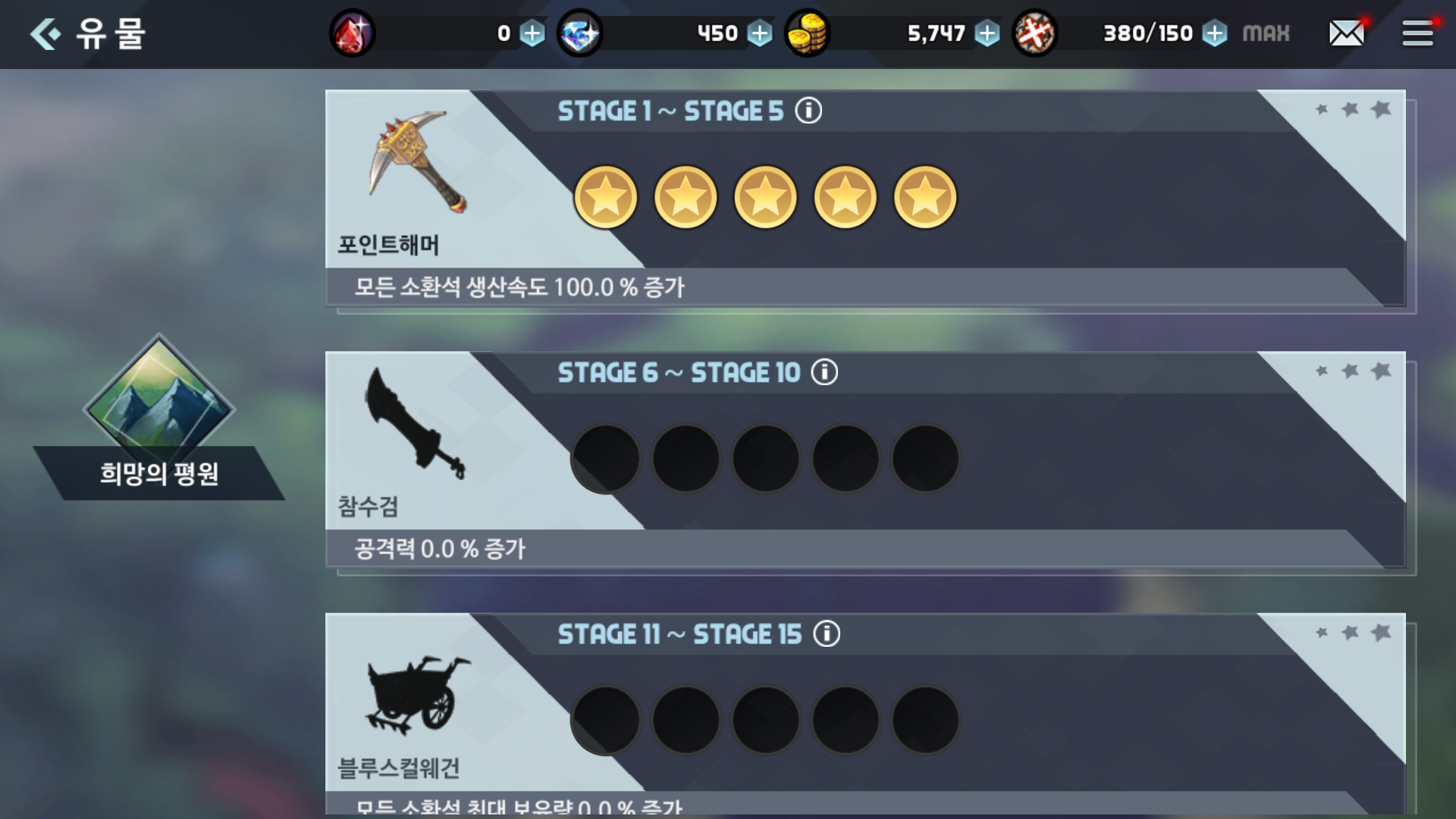 꽤 괜찮았던 시스템은 유물 시스템이 있는데 각 스테이지별로 유물을 얻으면 유물의 등급에 따라 효과를 얻을 수 있습니다. 유물은 금, 은, 동이 있으며 랜덤 획득이라는데 한 번에 금색을 얻을 수도 있고, 아무리 반복해도 안 나올 수도 있습니다.