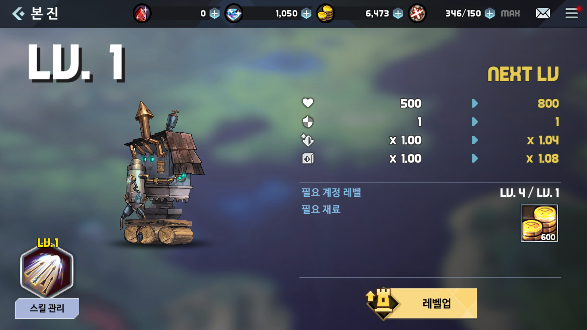 스테이지를 진행하다 보니 골드를 사용하여 베이스의 레벨 업도 가능하고, 전투에 유리하게 유닛 코스트를 낮춘다거나 쿨타임을 낮추는 강화도 가능합니다.