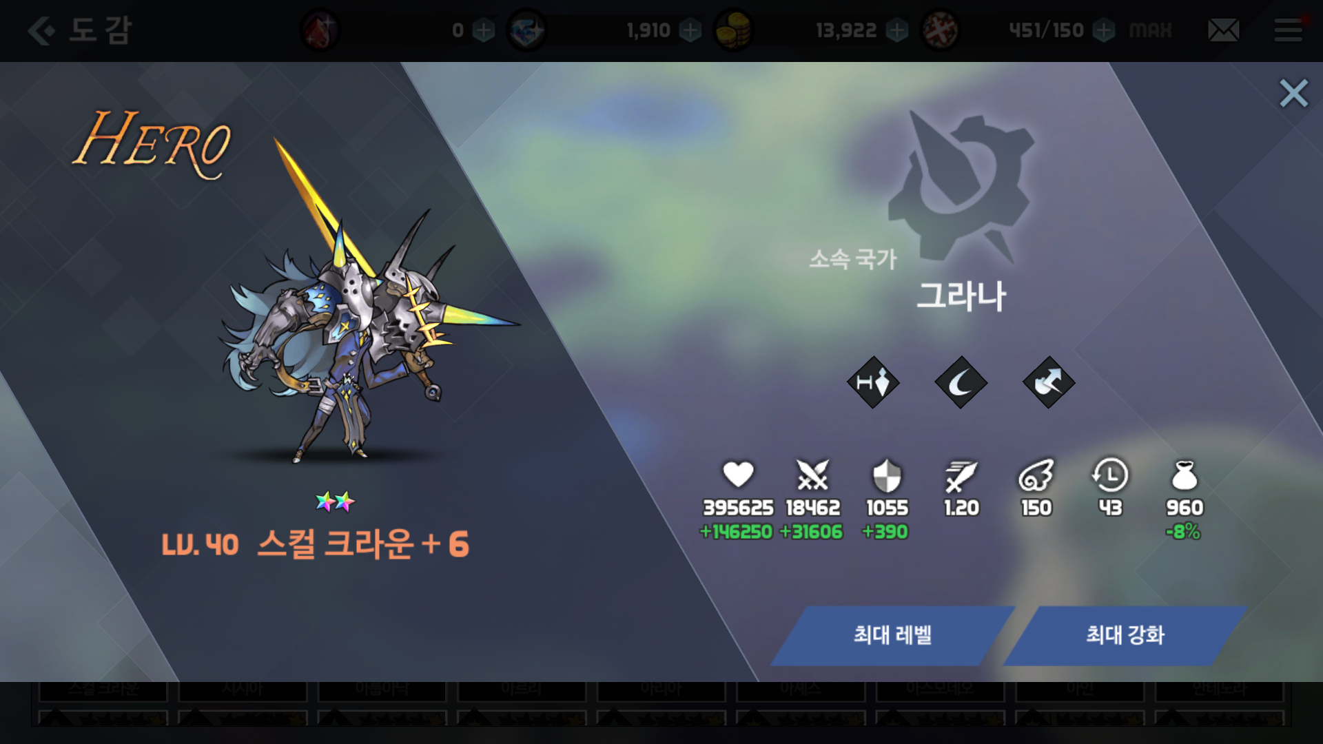 그런데 히어로 등급 중 하나를 찍어서 보니 풀강 기준 체력이 54만에 공격력이 5만이네요. 강화에 한계가 있기 때문에 등급이 좋은 유닛이 무조건 좋습니다.