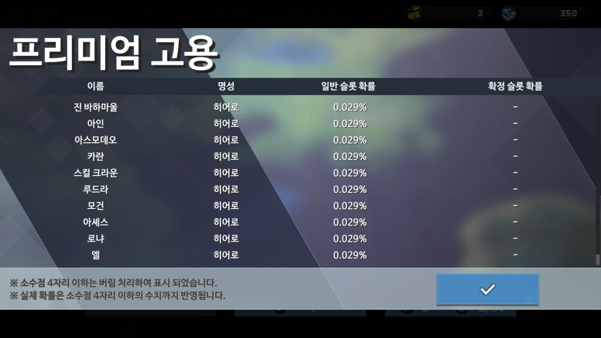 프리미엄 뽑기의 확률표입니다. 노비스는 제일 낮은 등급의 유닛인데 0.991%였고, 가장 높은 등급인 히어로 등급 유닛은 0.029%입니다. 그래도 히어로 등급이 나오기는 하네요. 보통 히어로 아래 등급인 마스터 등급만 나와도 잘 나온 거긴 한데, 등급 차이가 좀 큽니다.