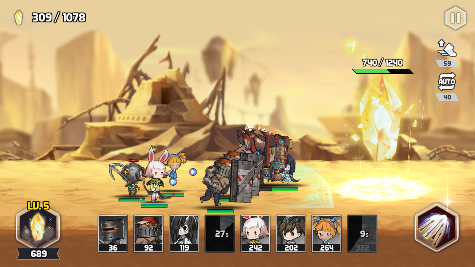 초반에는 별다른 게 없습니다. 그냥 40짜리만 계속 뽑으면 이겨요. 왼쪽 아래 수정 레벨을 올려서 높은 유닛을 생산하는 것보다 그냥 쿨마다 40짜리 찍어내는 게 훨씬 더 빠릅니다.