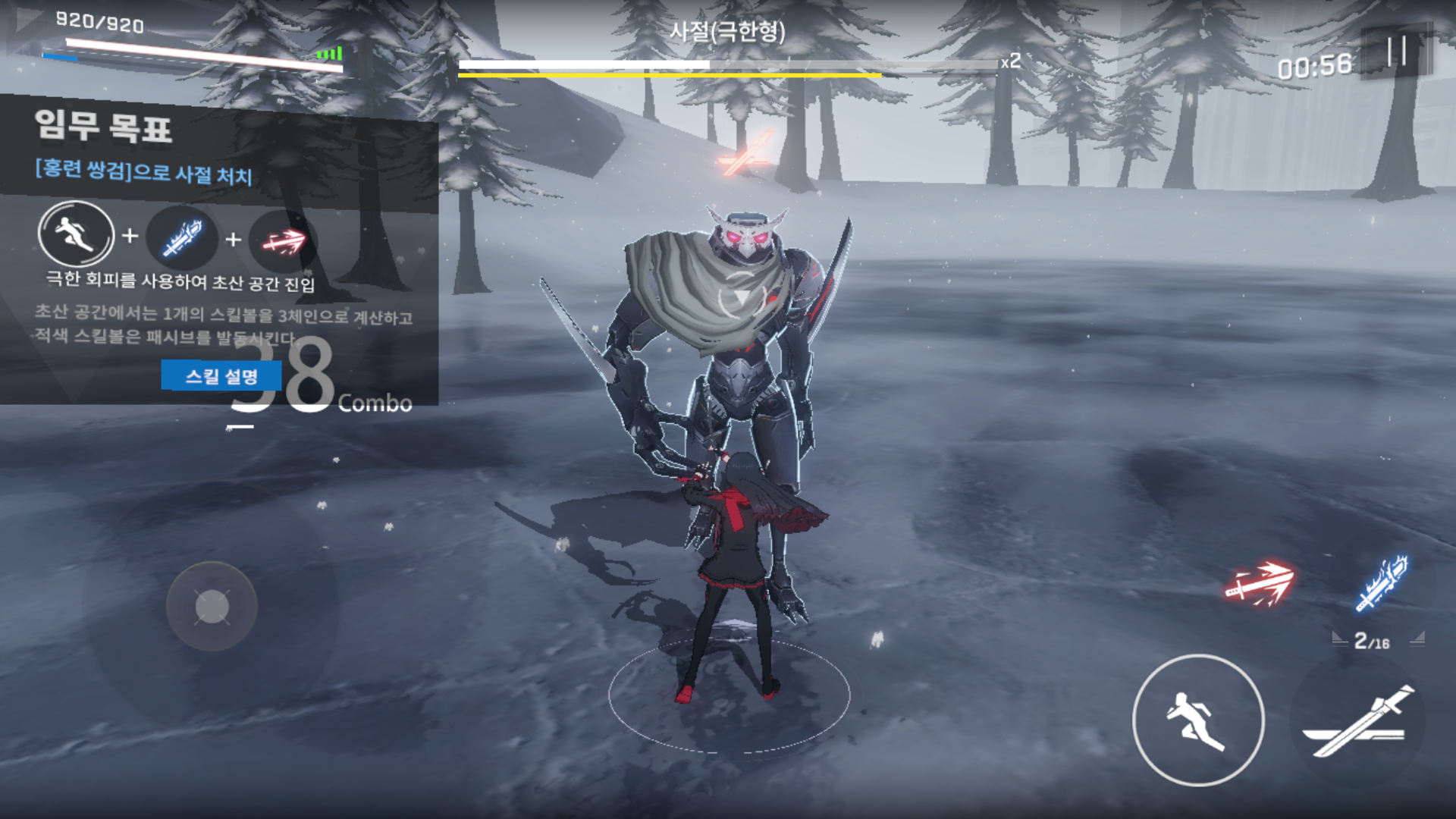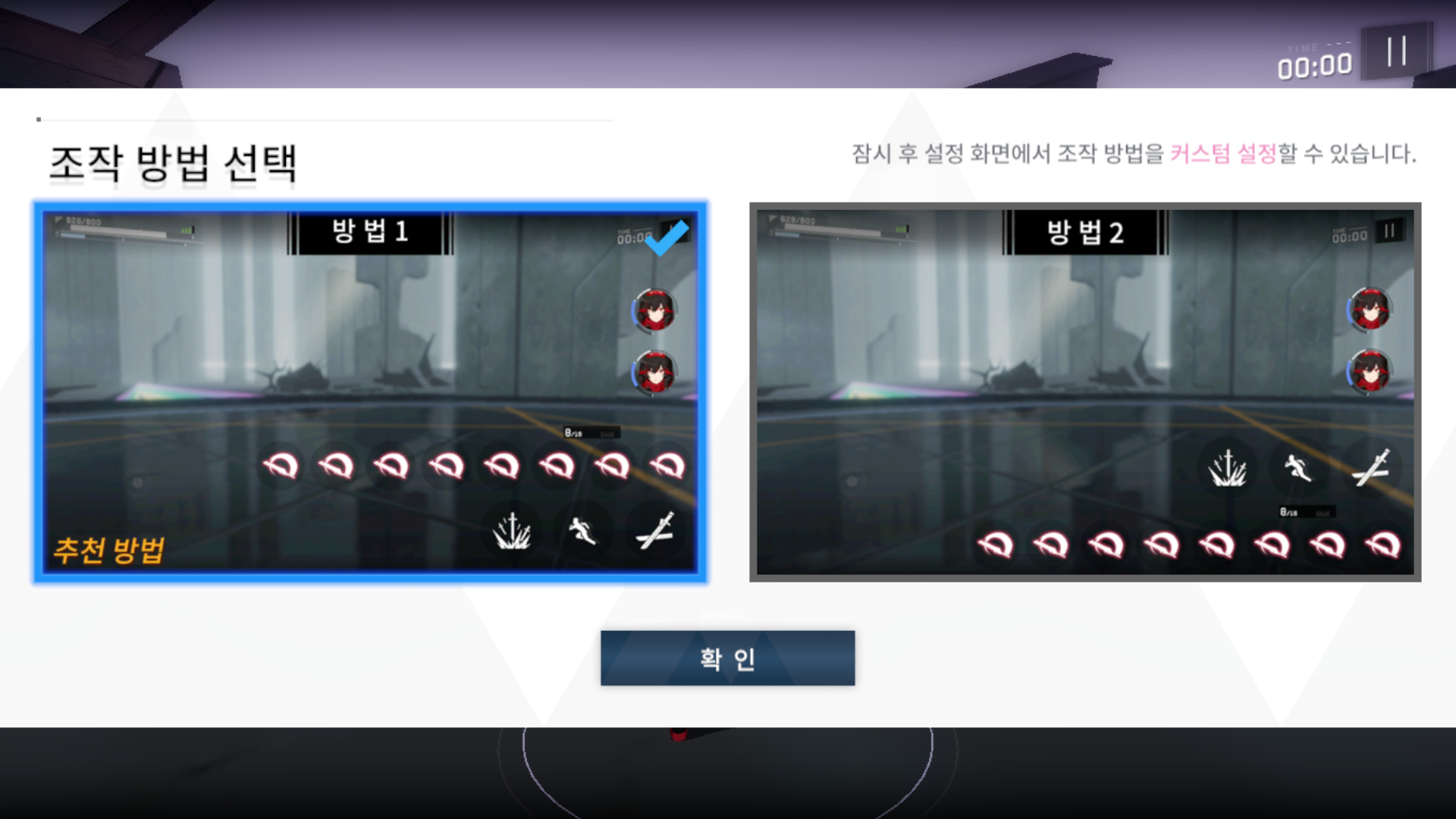 우선 조작 방법을 선택할 수 있습니다. 크게 다른 점은 없고 공격, 회피, 필살기 버튼과 스킬의 위치만 다릅니다.