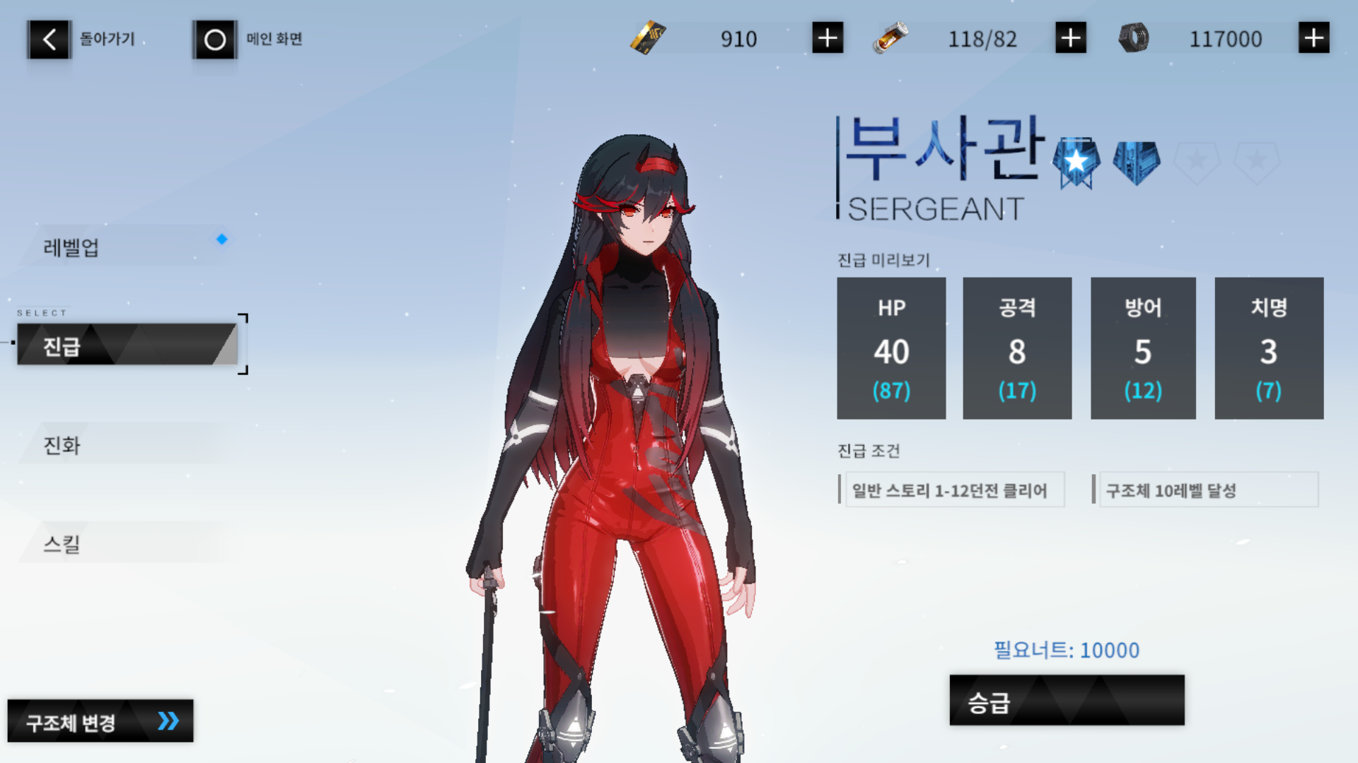 캐릭터는 승급이 가능한데, 진급 조건으로 스테이지 진행도와 레벨을 필요로 합니다.
