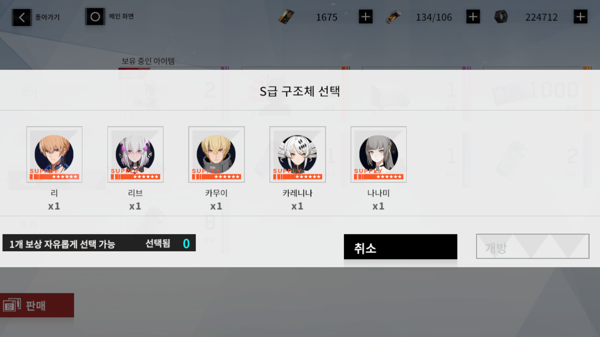 창고에서 우편함으로 받은 구조체 선택권을 누르니 이렇게 5개의 S등급 구조체가 나오네요.