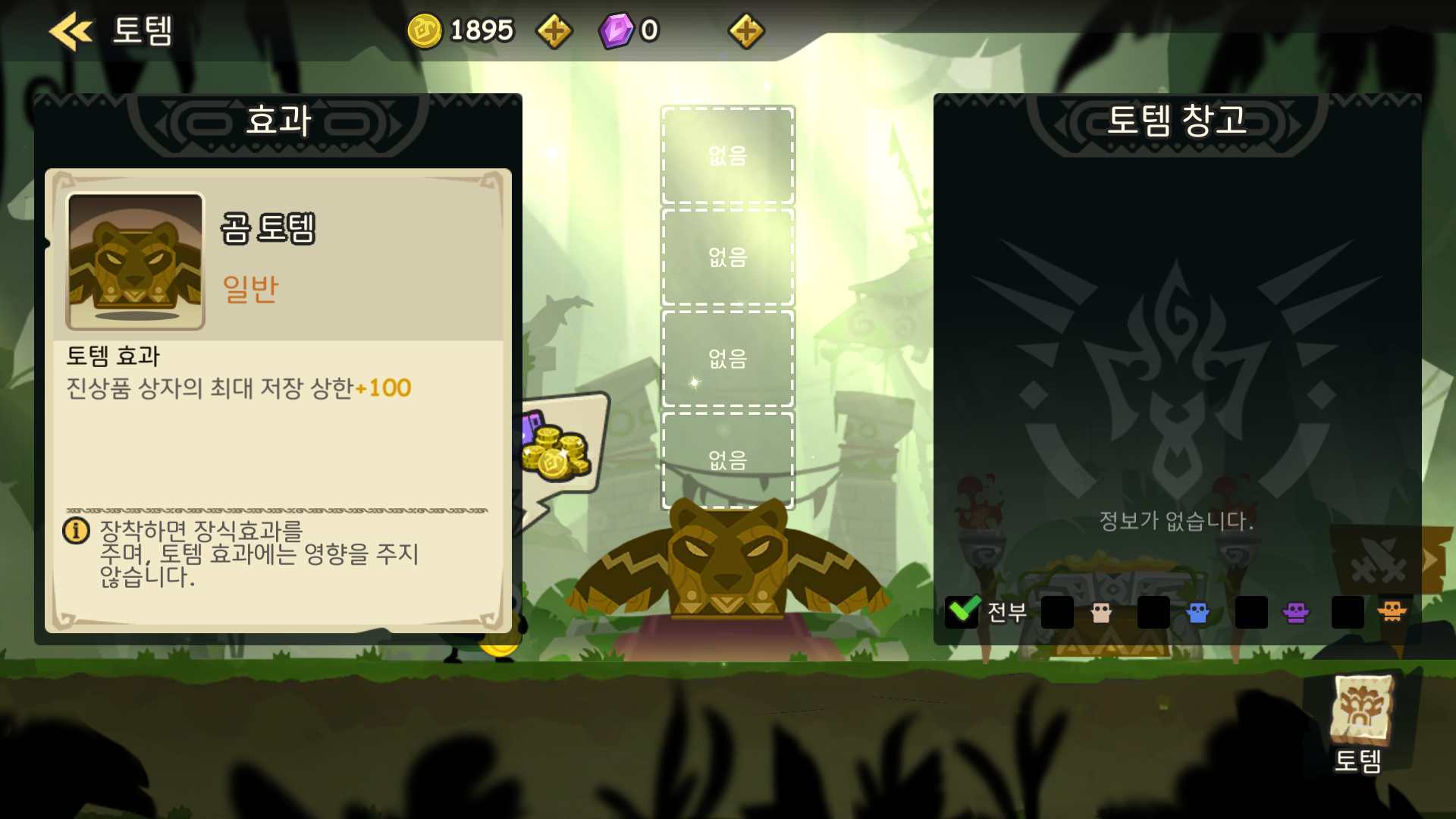 토템이라는 것도 있는데 토템 창고에 있는 토템을 쌓아 올려 버프를 받을 수 있는데 초반이라 저 곰 토템밖에 못 얻었습니다.