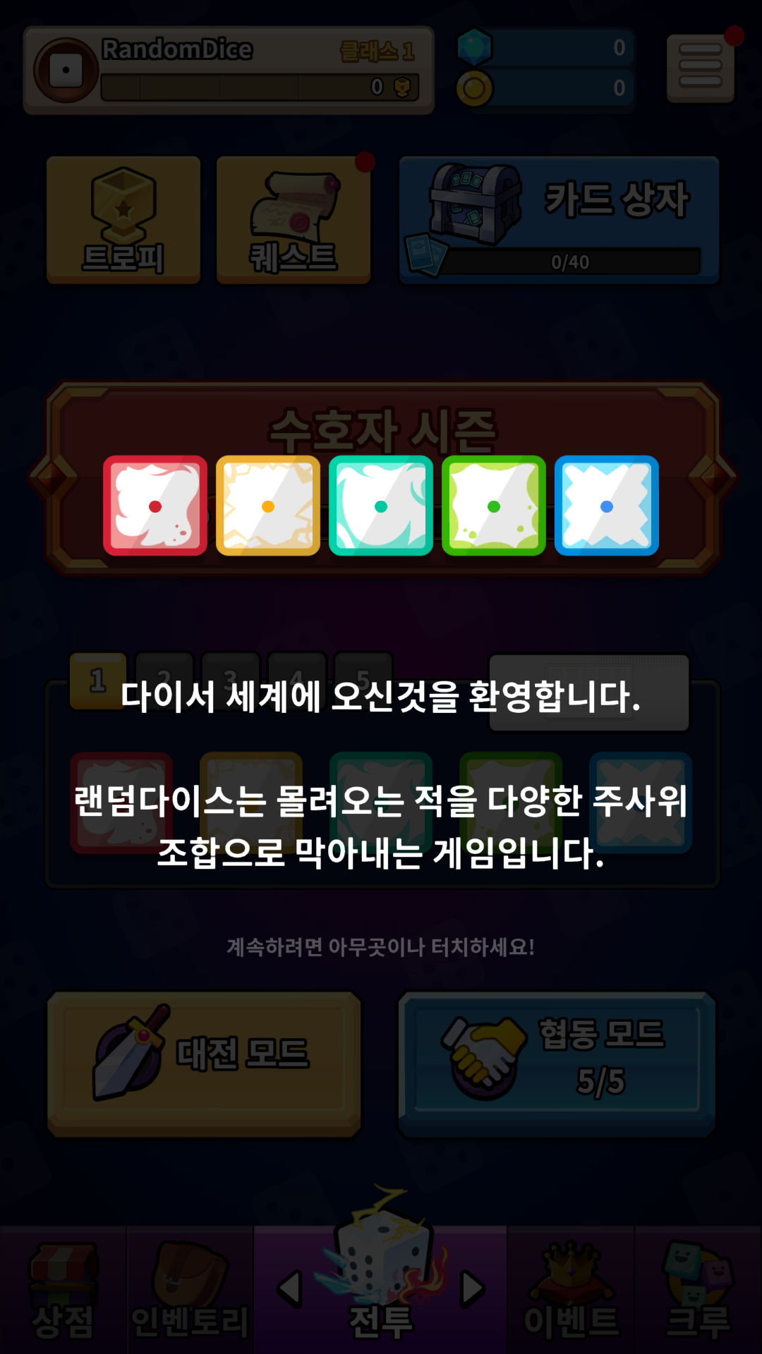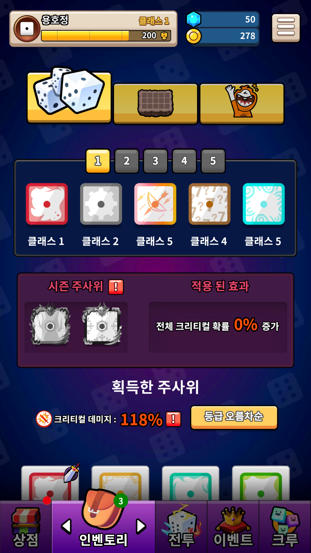 이렇게 클래스 3까지 찍고 마무리를 했는데 가디언 크로니클은 경쟁보다 협동전이 훨씬 재밌었다면, 이 게임은 둘 다 재밌습니다. 다만, 가디언 크로니클은 협동전 횟수에 제약이 없었는데 랜덤 다이스는 아쉽게도 일일 5회 제한이 있습니다. 이후는 말씀드린 대로 충전을 하거나 광고를 봐야 해요.