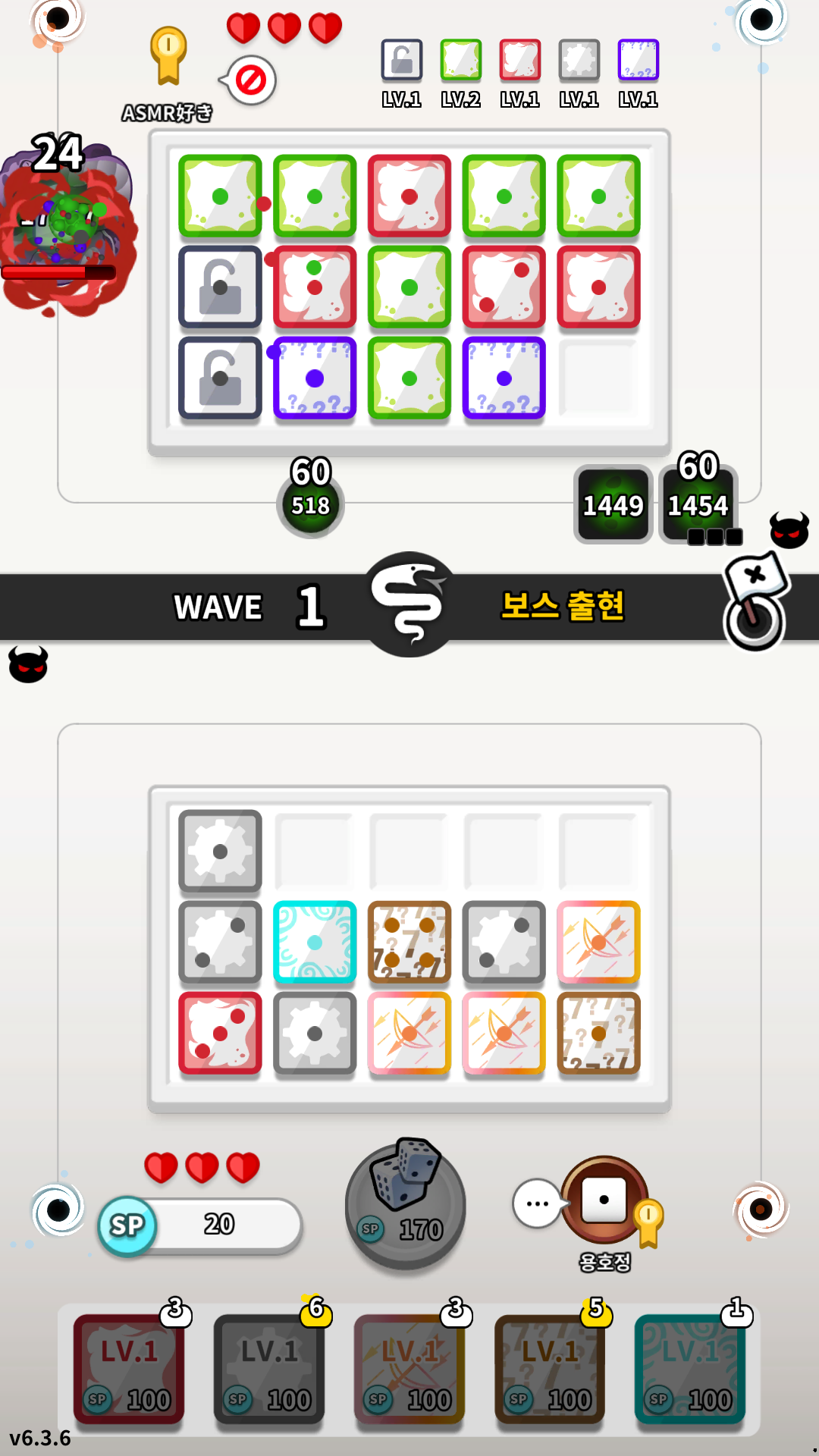 몬스터를 잡아서 SP를 획득하고 획득한 SP는 주사위를 소환하거나 강화에 사용할 수 있습니다. 최대한 같은 종류의 주사위로 만들어서 하나를 업그레이드하는 게 좋아 보이네요.