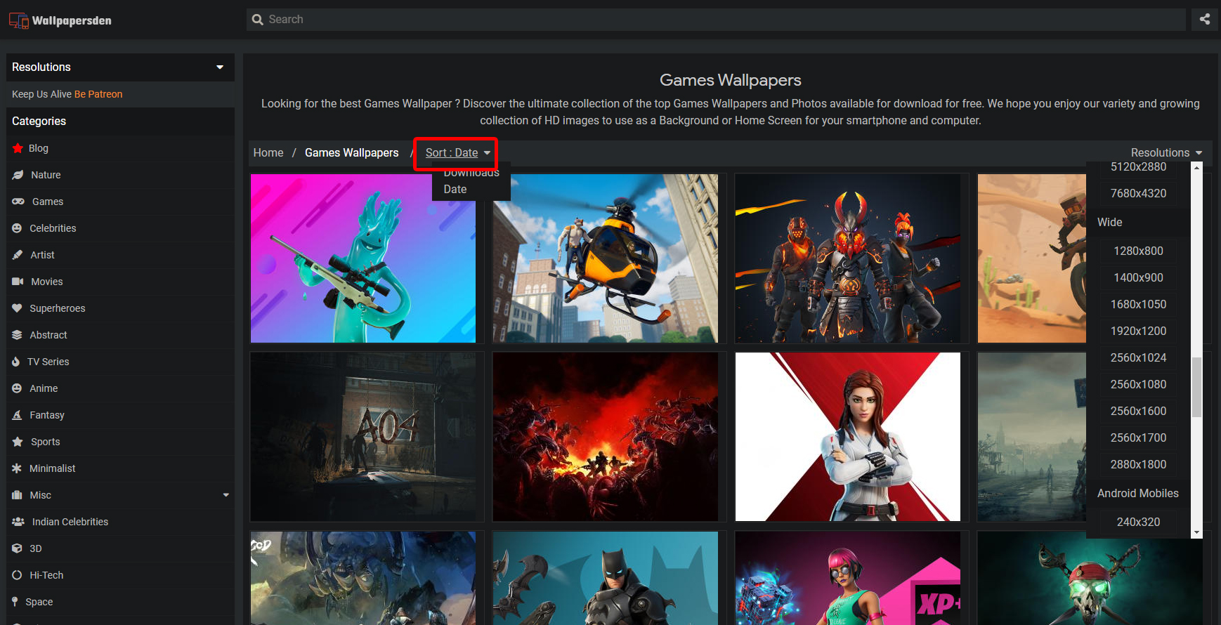 오른쪽 위에서 자신의 바탕화면에 맞는 해상도를 선택해줍니다. 카테고리 위쪽에 있는 왼쪽 상단에서 하셔도 돼요.