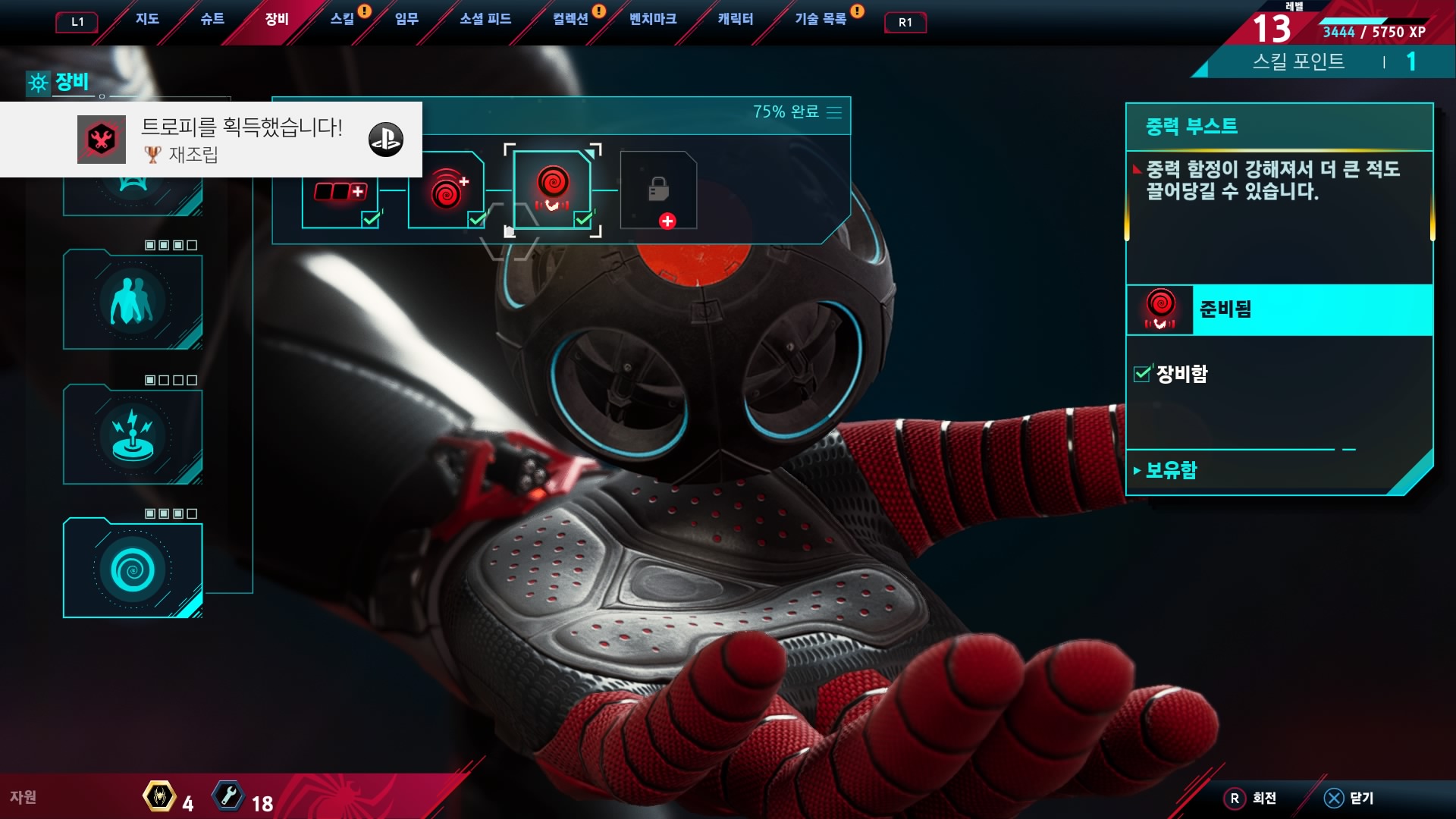 이 게임이 슈트도 적은데 스파이더맨이 사용하는 장비도 적어요. 전작은 8갠가 그랬던 것 같은데 딱 4개 있습니다.
