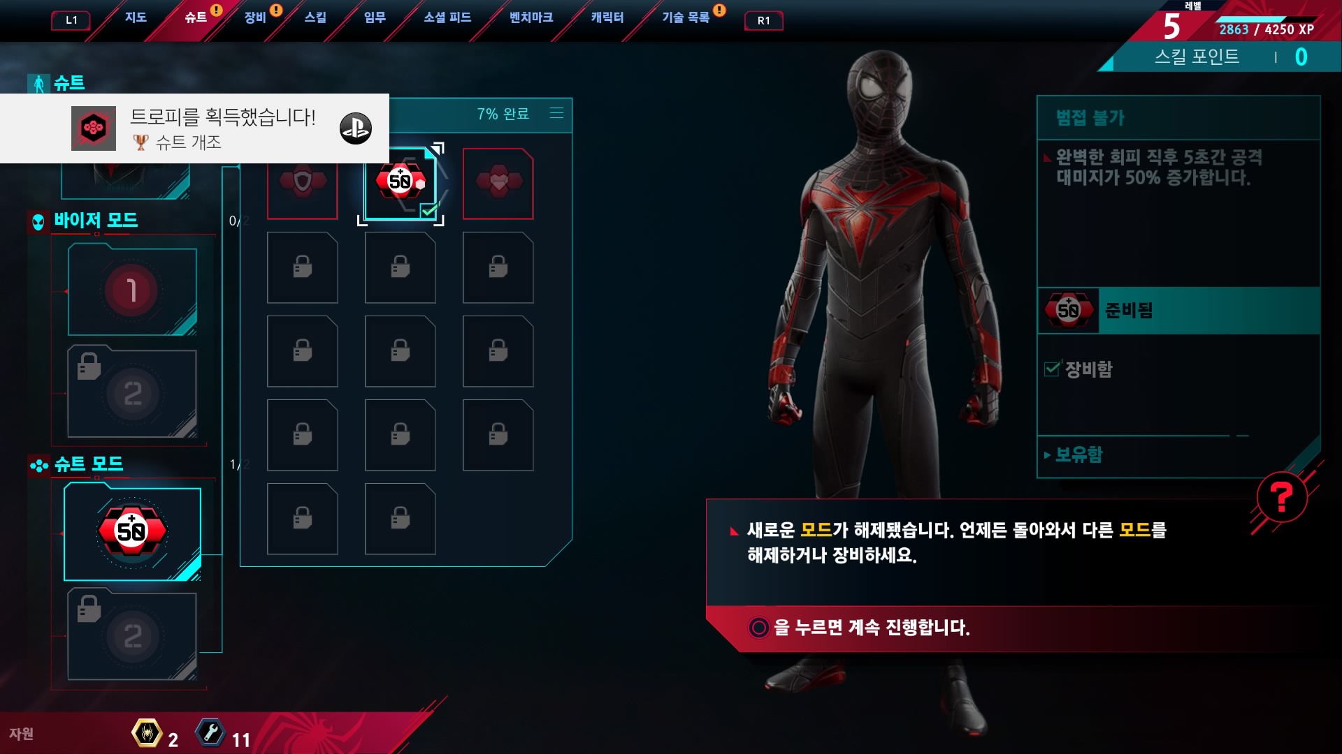 그런데 슈트 종류가 되게 적어요. 평균 플레이 타임도 전작은 24시간이었다면 마일즈 모랄레스는 12시간으로 절반밖에 되지 않습니다.