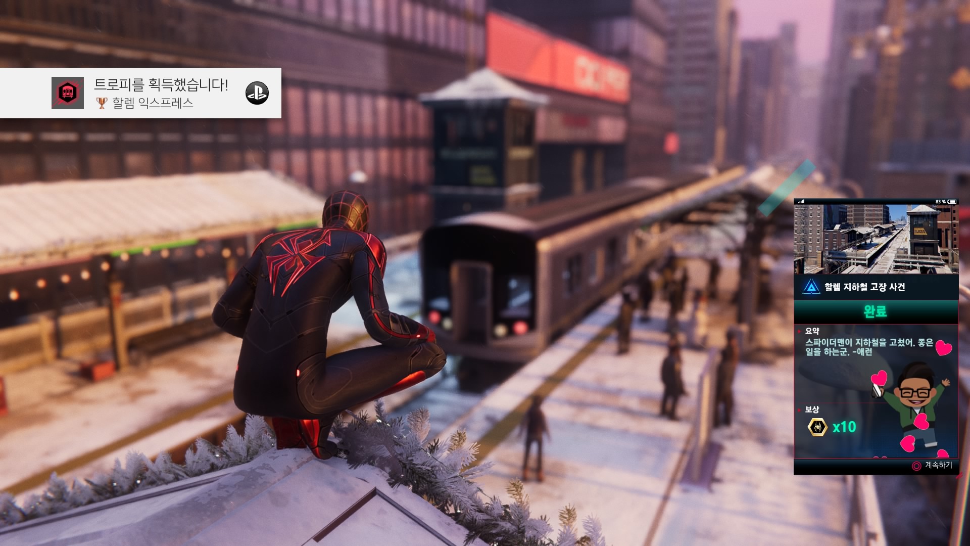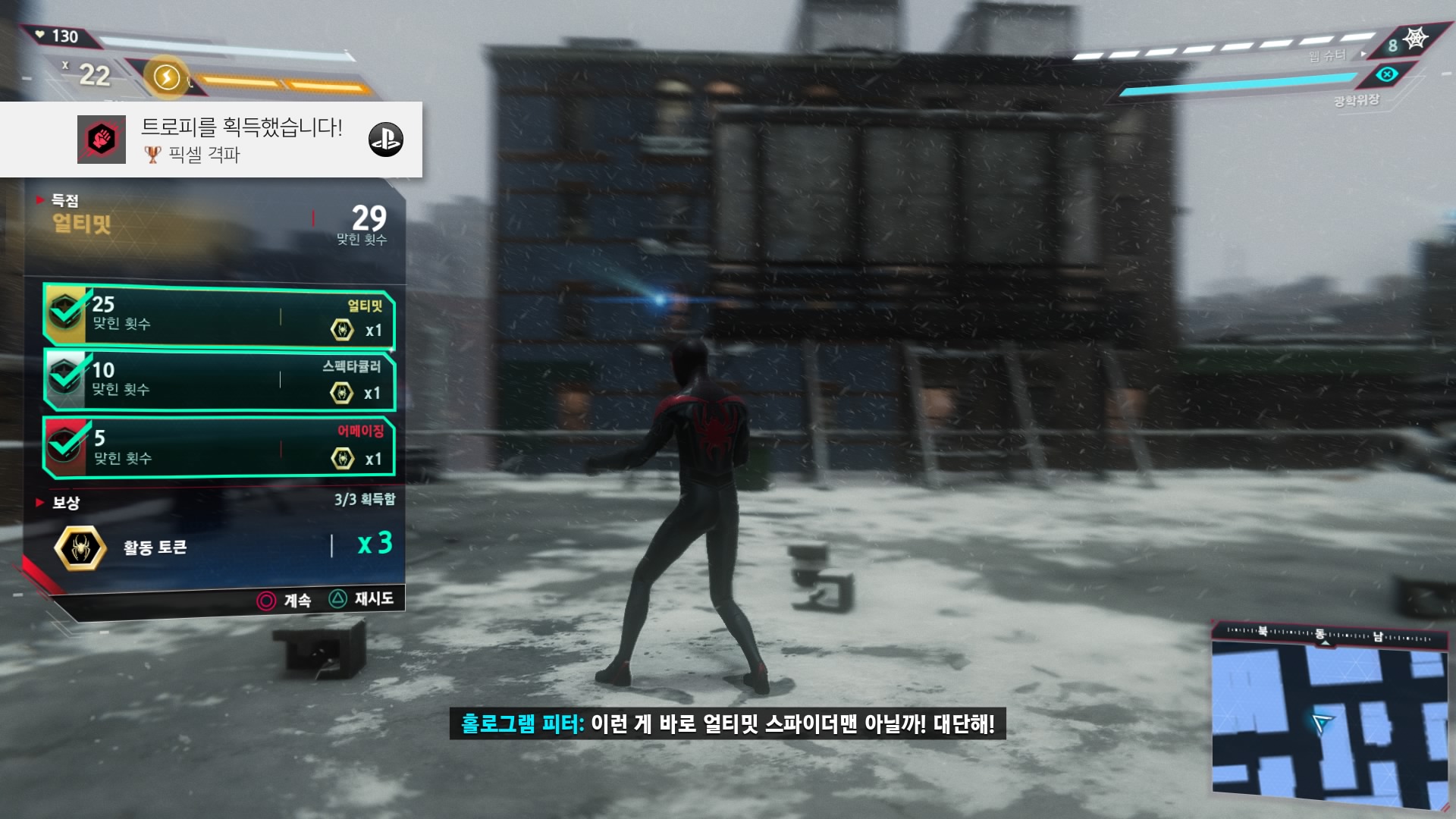 마블스 스파이더맨의 후속작 '마블스 스파이더맨: 마일즈 모랄레스' 엔딩을 봤습니다. 전작과 다 비슷한데 약간 능력이 다르고 게임 볼륨도 전작에 비해 작은 편이라 가볍게 즐기기에는 좋았지만 조금 아쉽기도 하네요. 스토리도 재밌긴 한데 뭔가 아쉬워요. 전작도 플레티넘 트로피를 땄으니 이번에도 플레티넘 트로피를 딸까 생각해봤지만, 차라리 아직 못 깬 전작 DLC를 하는 게 나을 것 같아서 엔딩만 보고 지웠습니다.