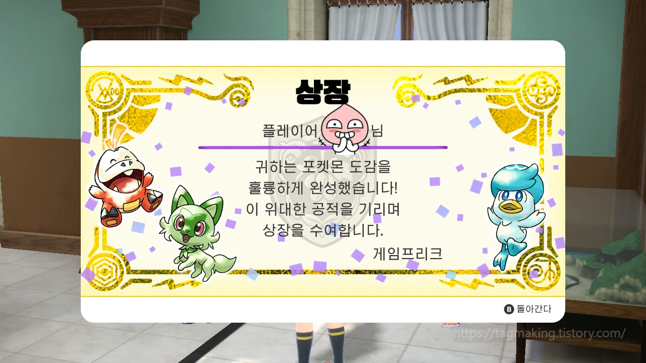 이름은 가렸는데 도감을 다 모으니 이런 상장도 주네요. 딱히 의미는 없고 기분만 조금 좋습니다. 확실히 포켓몬은 여러 버전을 다 해야하는게, 이 버전에서 구하기 힘든 포켓몬이 다른 버전에서 구하기 쉽고, 다른 버전에서 구하기 어려운 포켓몬이 또 다른 버전에서 구하기 쉽고 해서 여러 버전을 같이 하는게 도감작에 유리한 것 같아요.