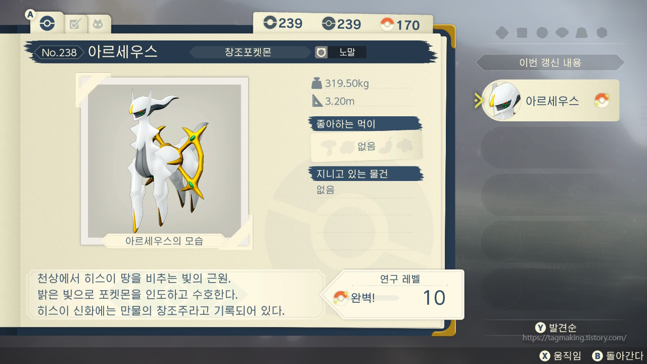 도감작의 이유였던 아르세우스입니다. 아르세우스는 지급하자마자 연구레벨이 10으로 지급되더라구요. 추가로 더 얻을 수 없으니 10레벨이 의미는 딱히 없지만, 모든 포켓몬의 연구레벨 10을 달성하면 이로치 확률을 올려주는 '빛나는부적'을 주기 때문에 10레벨로 지급하는 것 같습니다.