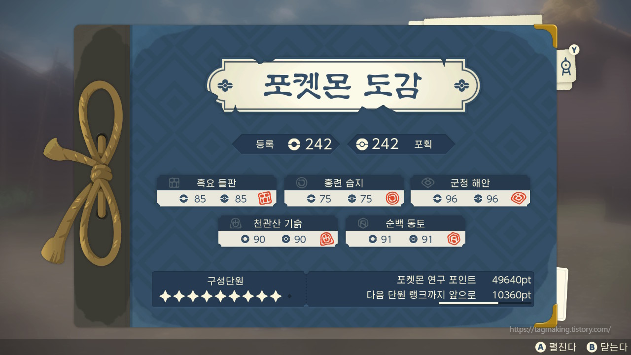 기존의 포켓몬 시리즈와 또 다른 부분은 도감입니다. 도감에는 연구레벨이 있고, 도감이 요구하는 해당 포켓몬의 행동을 관찰해야 연구 레벨이 오르는 방식입니다. 10레벨이 최대이고, 10 레벨을 넘어 모든 연구 항목을 완료하면 이로치 확률이 올라간다고 하네요.