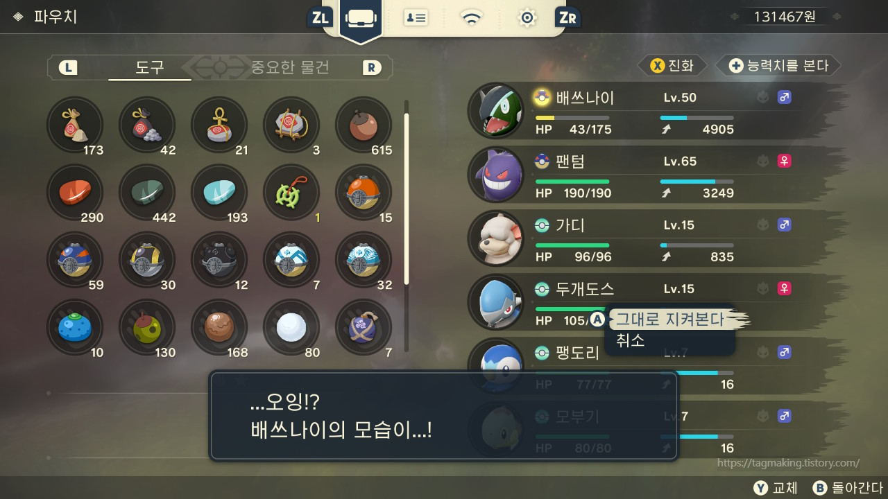 포켓몬스터 레전드 아르세우스를 플레이해봤습니다. 플레이타임은 엔딩 보는데 30시간정도, 도감을 다 채우고 아르세우스를 얻고나니 60시간이 조금 안되네요. 다시하면 더 빨리 할 수 있을것같은데 처음 보는 시스템이라 신기해서 이것 저것 하다보니 오래 걸린 것 같습니다. 처음 게임을 했을때 신기했던게 배틀을 하지 않고 포켓몬을 잡는다는 시스템과 배틀 방식도 턴제는 턴제인데 스피드에 따라 연속 턴을 가져갈 수 있는 부분도 신선했습니다. 단, 기존 시스템과 달라 호불호가 갈릴 수 있겠네요.
