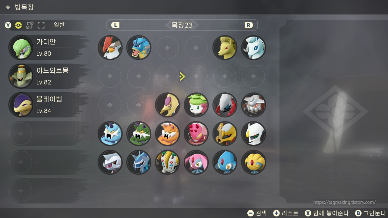 마지막은 전설 외 주로 사용했던 포켓몬들 모아놓은 목장이네요. 지금 보이는 포켓몬 외에도 마나피랑 피오네도 있는데 다른 페이지에 있는 것 같습니다. 여기서 보이는 포켓몬들이 모두 게임에서 구할 수 있는 전설 및 준전설 포켓몬인데 쉐이미와 다크라이는 평범한 조건으로 입수가 불가능한데, 소드&실드의 세이브 데이터가 있으면 '쉐이미'를 얻을 수 있고, 다이아&펄의 세이브 데이터가 있으면 '다크라이'를 얻을 수 있습니다. 그리고 두 포켓몬은 도감작에 포함되지 않습니다.
