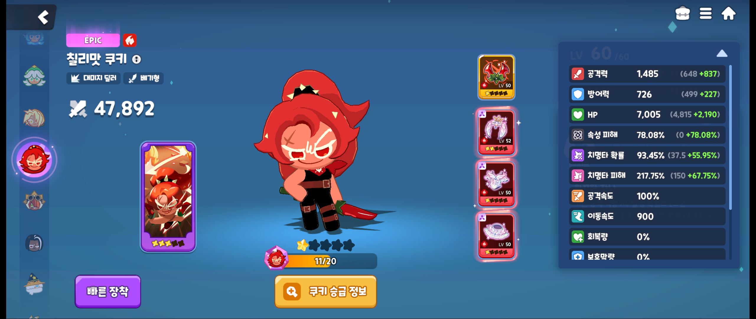 칠리 60레벨을 찍었습니다. 쿠키는 1성, 아티는 3성에 투력 4.7만입니다.